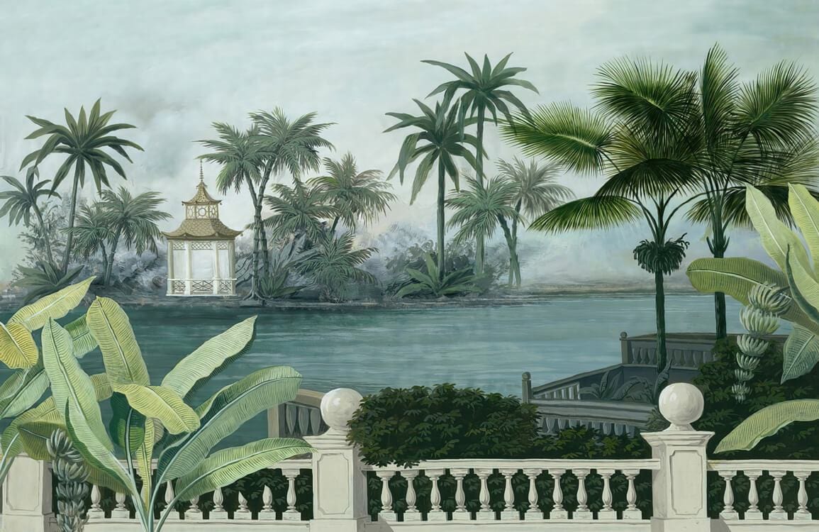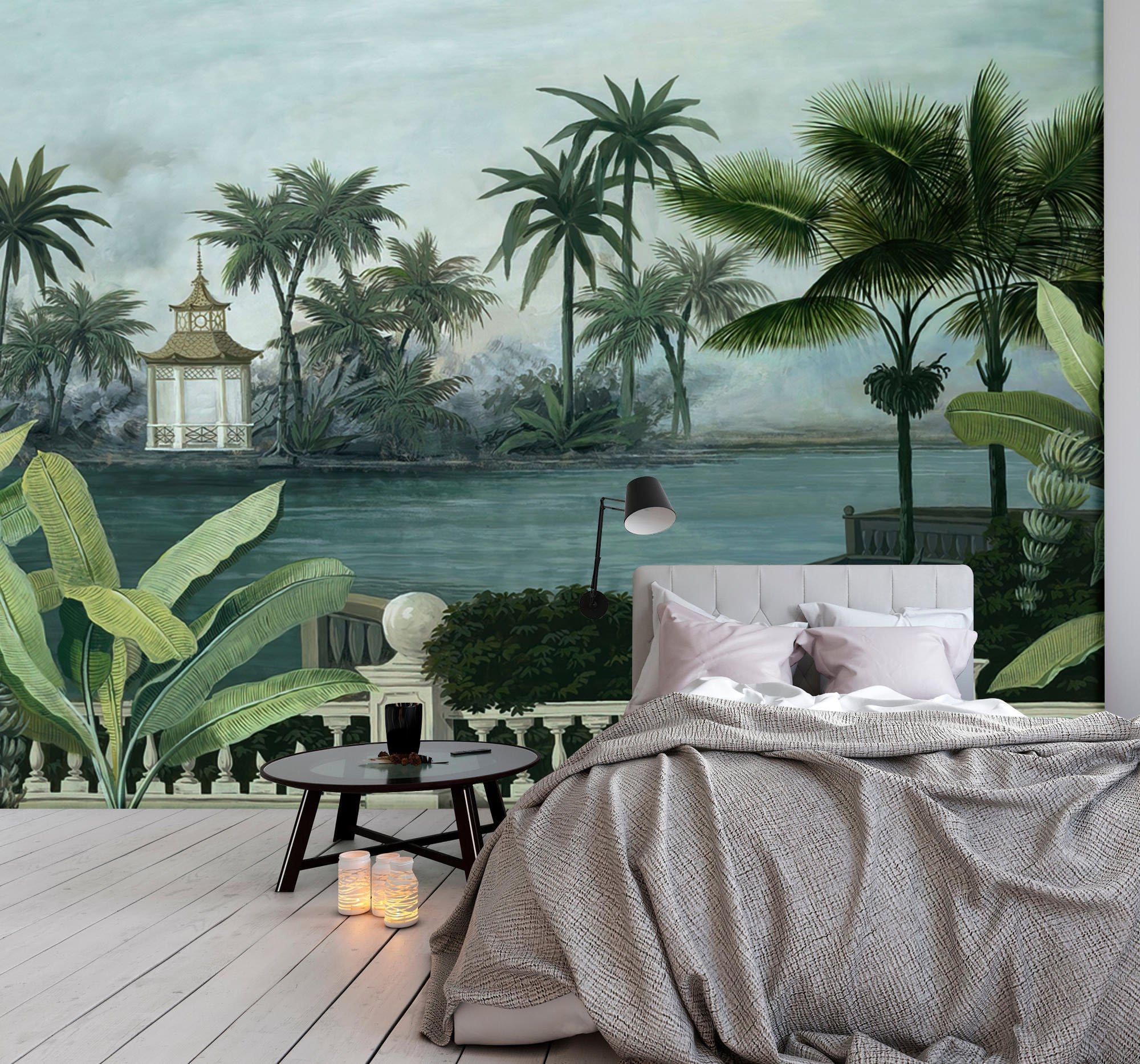 Immerse yourself in the tranquil elegance of the Tropical Riverbank Wallpaper Mural, capturing the serene landscape of lush palms and delicate foliage enveloping a picturesque riverside. This intricate design and soft, muted tones create a calm oasis, seamlessly complementing both contemporary and classic interiors.