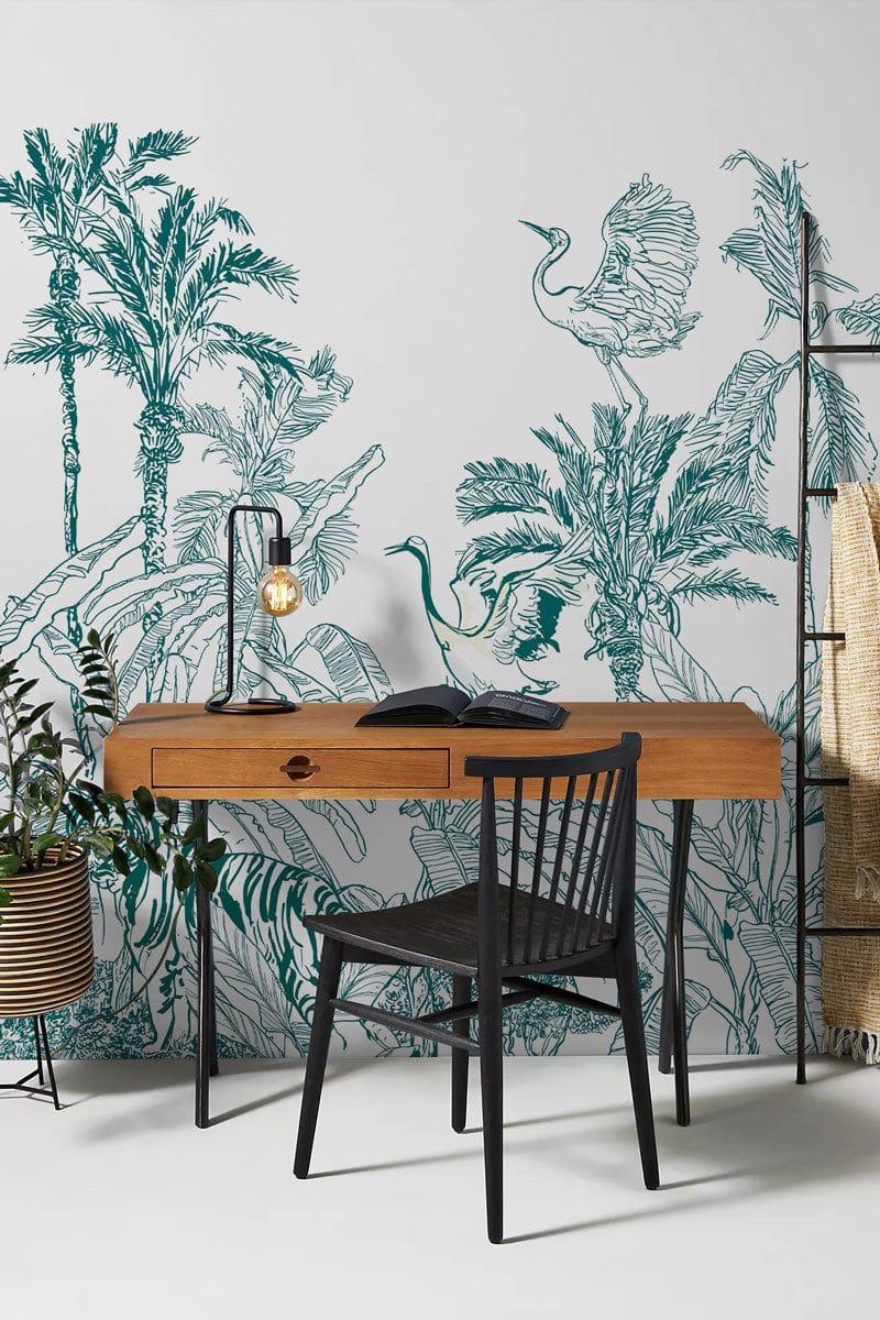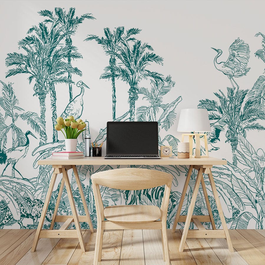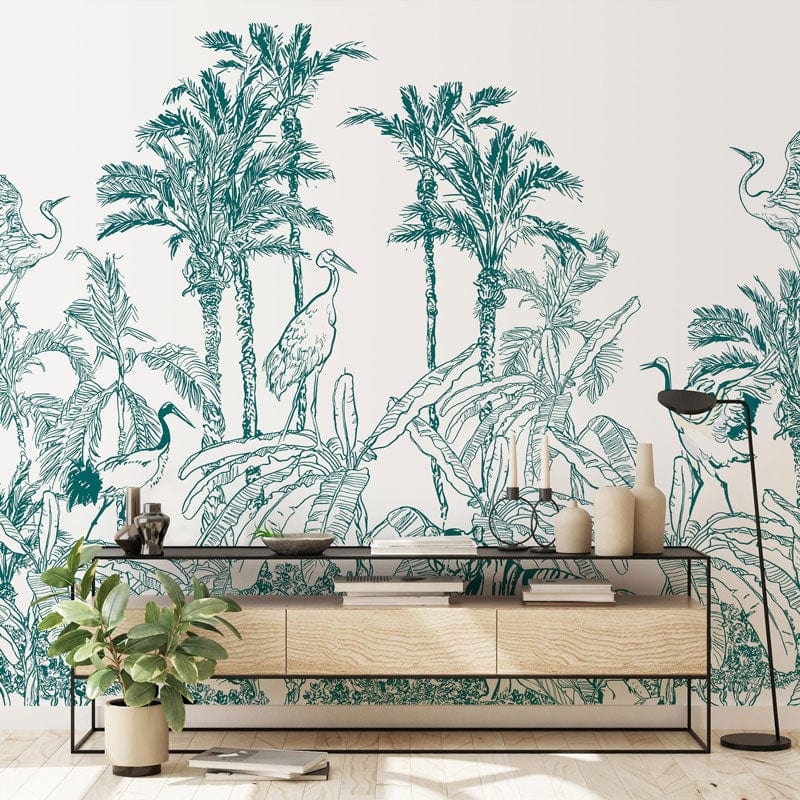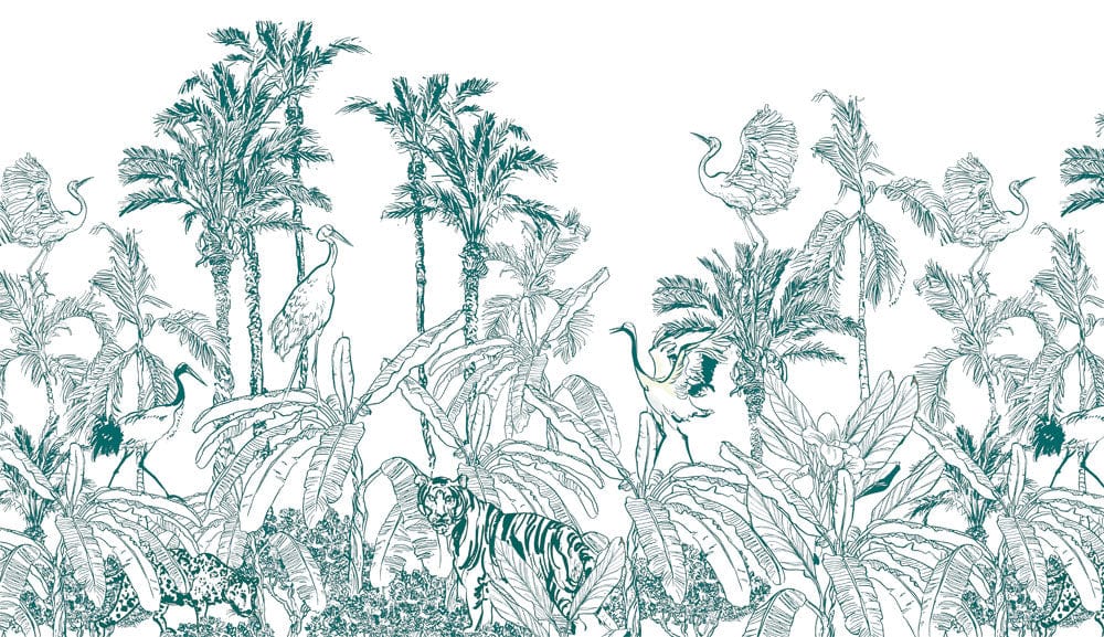 The Tropical Wilderness Harmony Mural Wallpaper exudes a serene elegance, with intricately illustrated cranes and tigers nestled amidst lush palm and banana leaves. This mural invites the tranquil beauty of nature indoors, blending detailed artistry with a subtle yet striking colour palette. Its delicate lines and sophisticated themes make it the ideal centrepiece for creating a serene, timeless atmosphere in any setting.