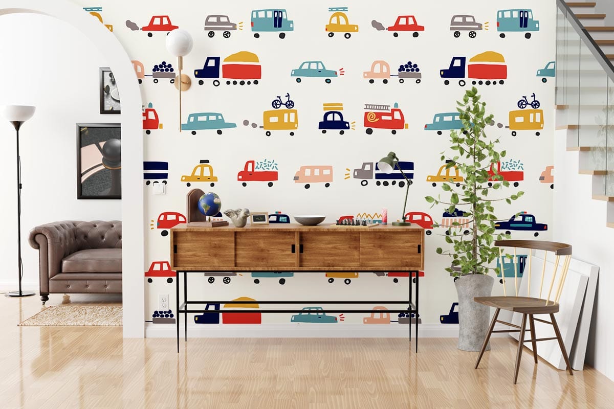 Make your kids attached to their rooms and give them a new decoration out of the ordinary with our new collection of Kids wallpapers we introduce Trucks mural wallpaper for those boys and kids who love playing with cars and love cars and trucks. This design is one of our illustrative designs that has different types of vehicles. Explain and help to enhance your kids鈥?knowledge and let them know the name of each vehicle and tell them facts and stories about what job does everyone involves in. and let them imagine what they want to be in the future. This simple design is so prefect for your boys鈥?room with off-white chiffon curtains and black or dark blue carpets for a nice contrast and for non-boring boys鈥?room.