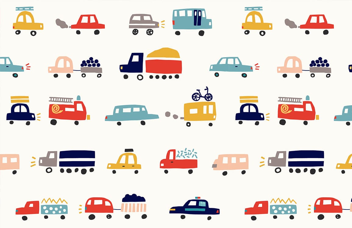 This Trucks Wallpaper Mural brings a charming retro touch to your interiors, featuring a playful parade of vehicles in a delightfully whimsical style. Each vehicle is meticulously illustrated with vivid details, offering a visual feast that captivates and entertains. The subtle tones and playful motifs effortlessly complement a variety of décor, making it an exquisite choice for adding a touch of nostalgia and delight to any space.