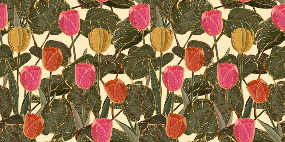 Tulip Focus Wallpaper Mural showcases an exquisite pattern of vibrant tulips in bloom, set against lush, dark foliage. The rich interplay of pinks and yellows creates a striking contrast, adding depth and elegance to its design. This mural exudes a classic charm while subtly infusing a modern touch, making it a versatile choice for any sophisticated interior space.