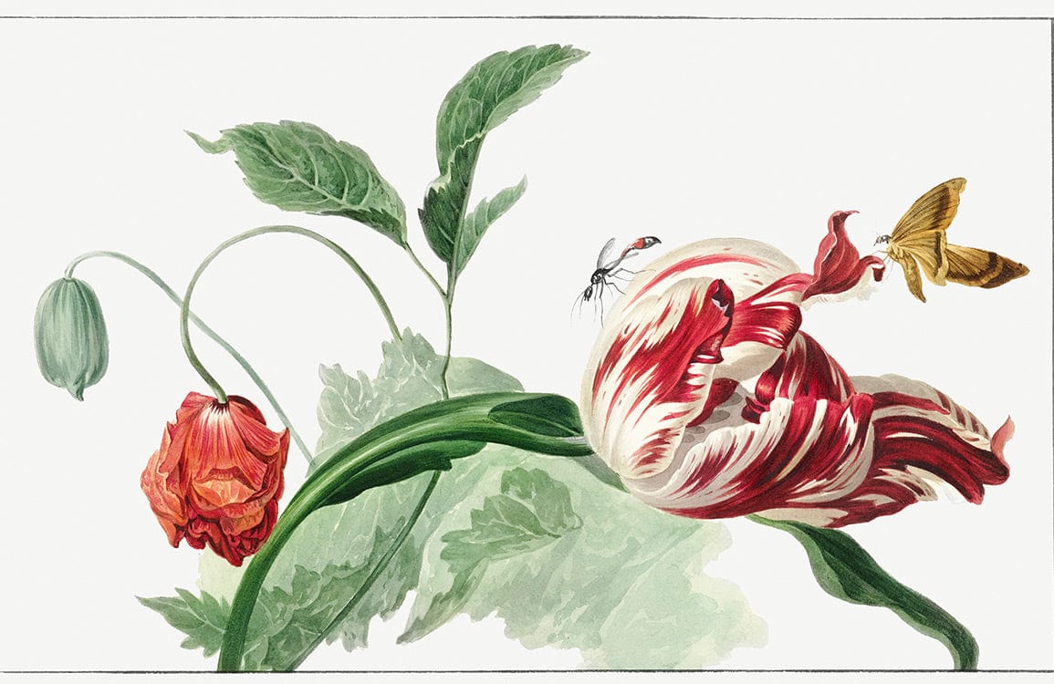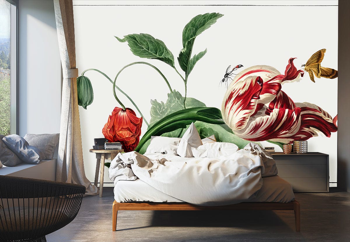 The Tulip & Poppy Wallpaper Mural captures the timeless beauty of nature with intricate botanical illustrations. Elegant tulips and poppies unfold amidst lush green foliage, rendering a serene sophistication to any room. Its detailed depiction reminiscent of classic botanical art creates an inviting ambience that's both refined and versatile, making it ideal for diverse settings.