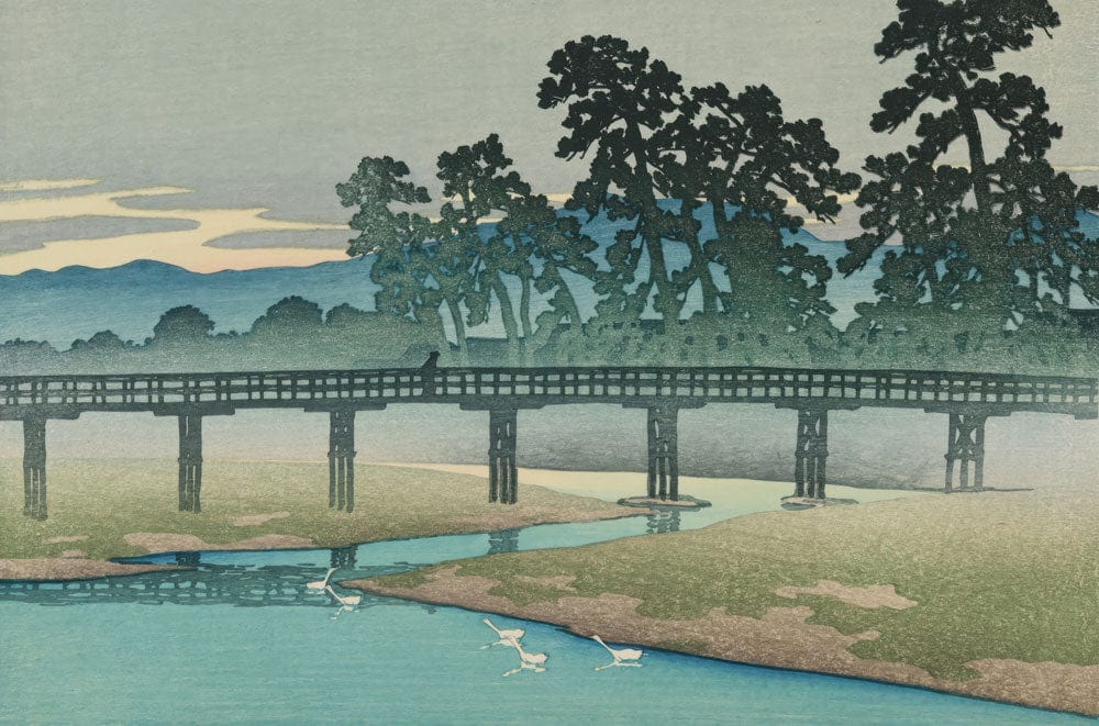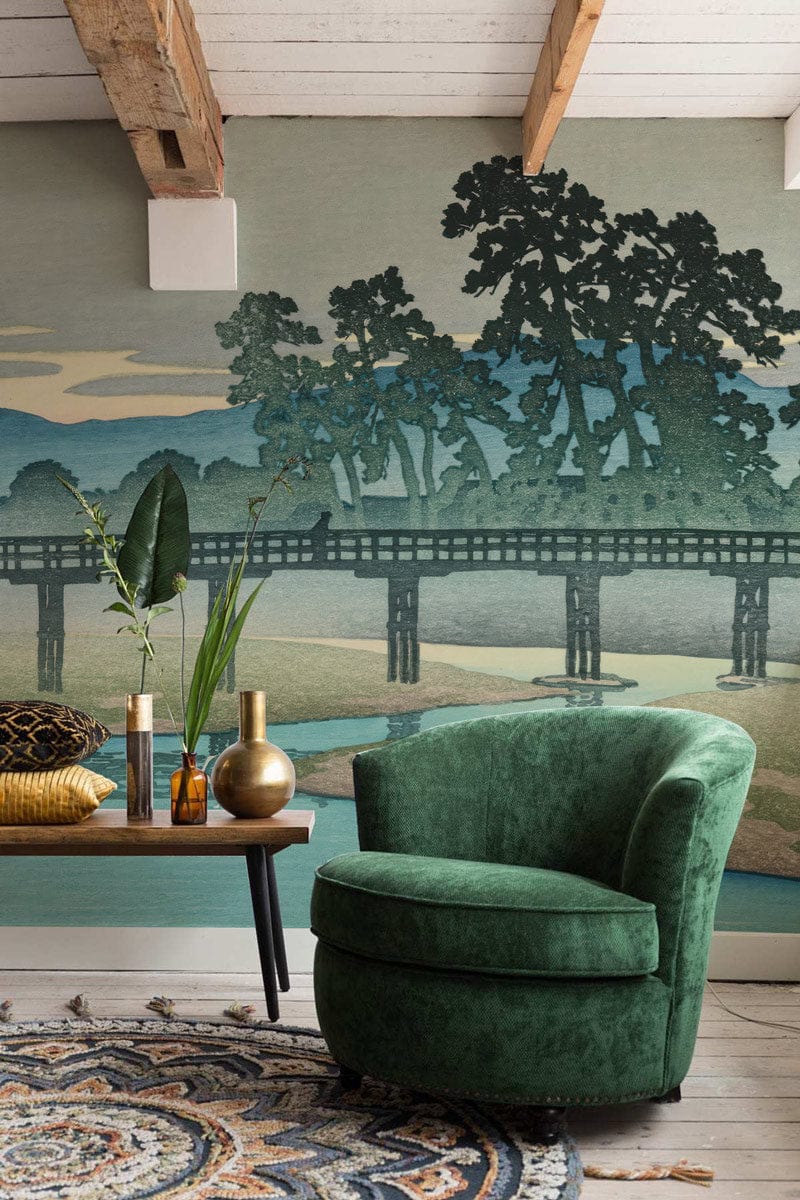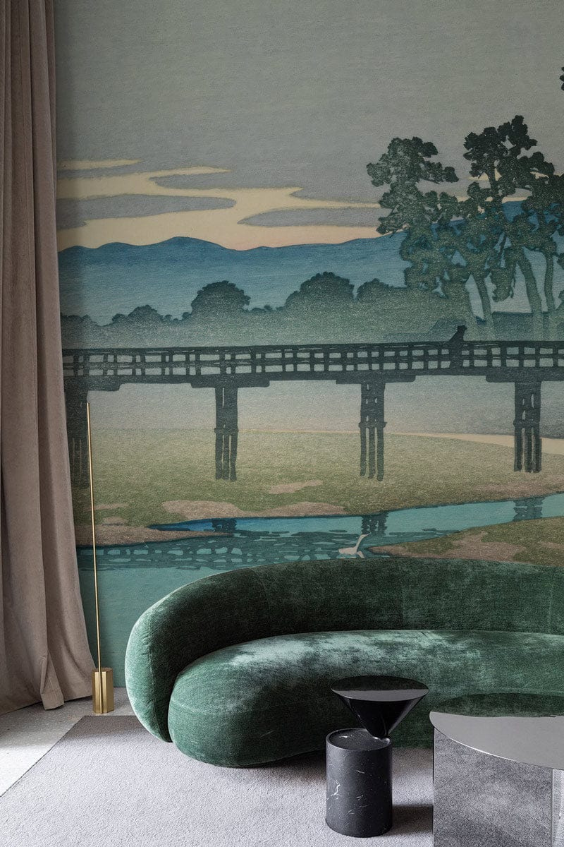 Immerse your space in the serene elegance of the Twilight Bridge Harmony Mural Wallpaper. Capturing the quiet grace of a bridge enveloped by lush trees and tranquil waters, this design brings a soft blend of muted tones to any setting. The intricate textures and harmonious layers lend a refined touch, making it a sublime choice for both contemporary and traditional interiors.