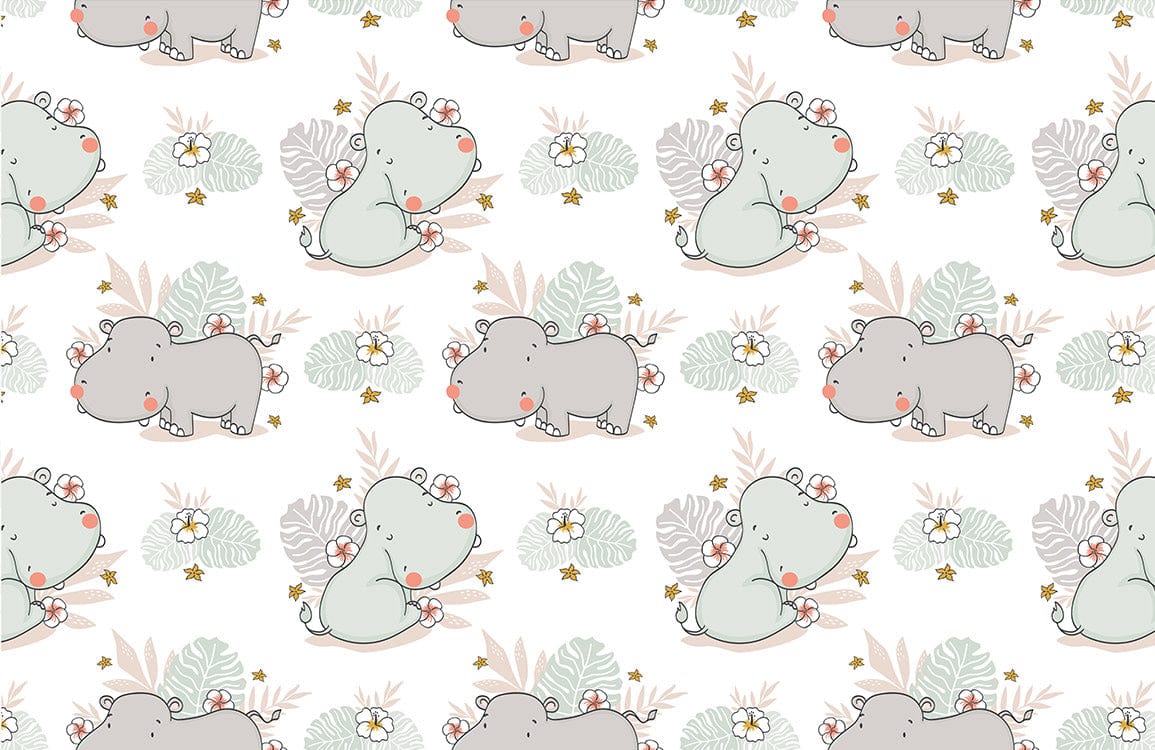 Hippos' Happy Life is an animal mural wallpaper with a twin hippo on a floral-themed oasis pattern. The lovely cartoon images of hippos are delightfully humorous, depicting a scene where the hippo babies love their serene environment, and they enjoy their happy life in the natural world. With hippos sitting and walking in a peaceful meadow, it will create a fun and inviting atmosphere in your home. This adorable mural will be a great decoration for your nursery wallpaper mural.