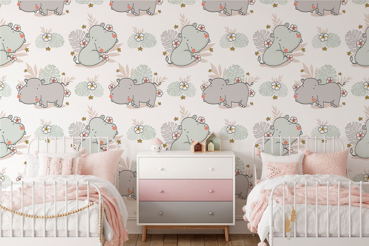The 'Hippos' Happy Life' Wallpaper Mural invites a playful elegance into your home, featuring whimsical hippo motifs delicately surrounded by floral accents. The soft hues create a serene backdrop, effortlessly elevating any space with its charming appeal.