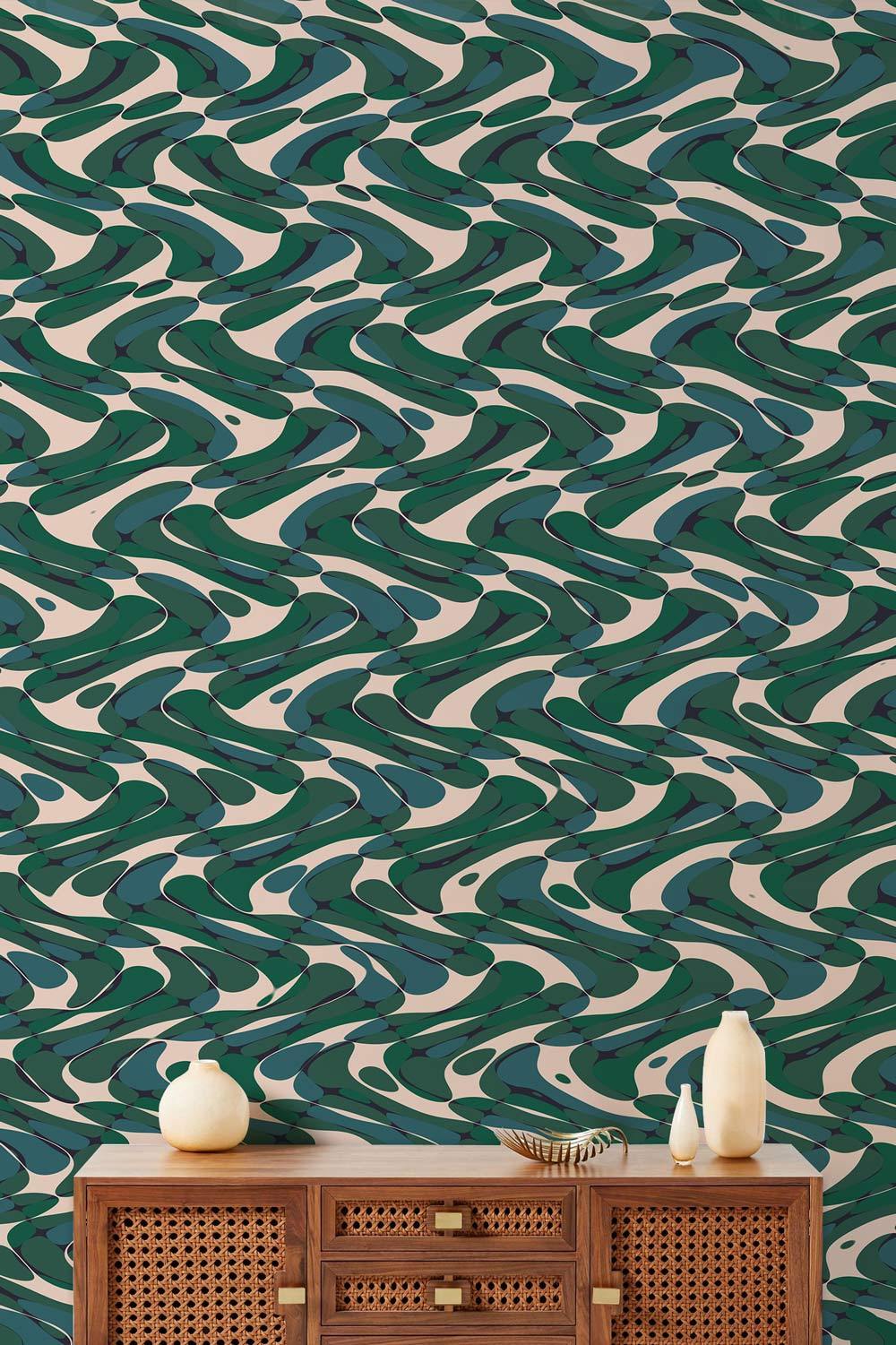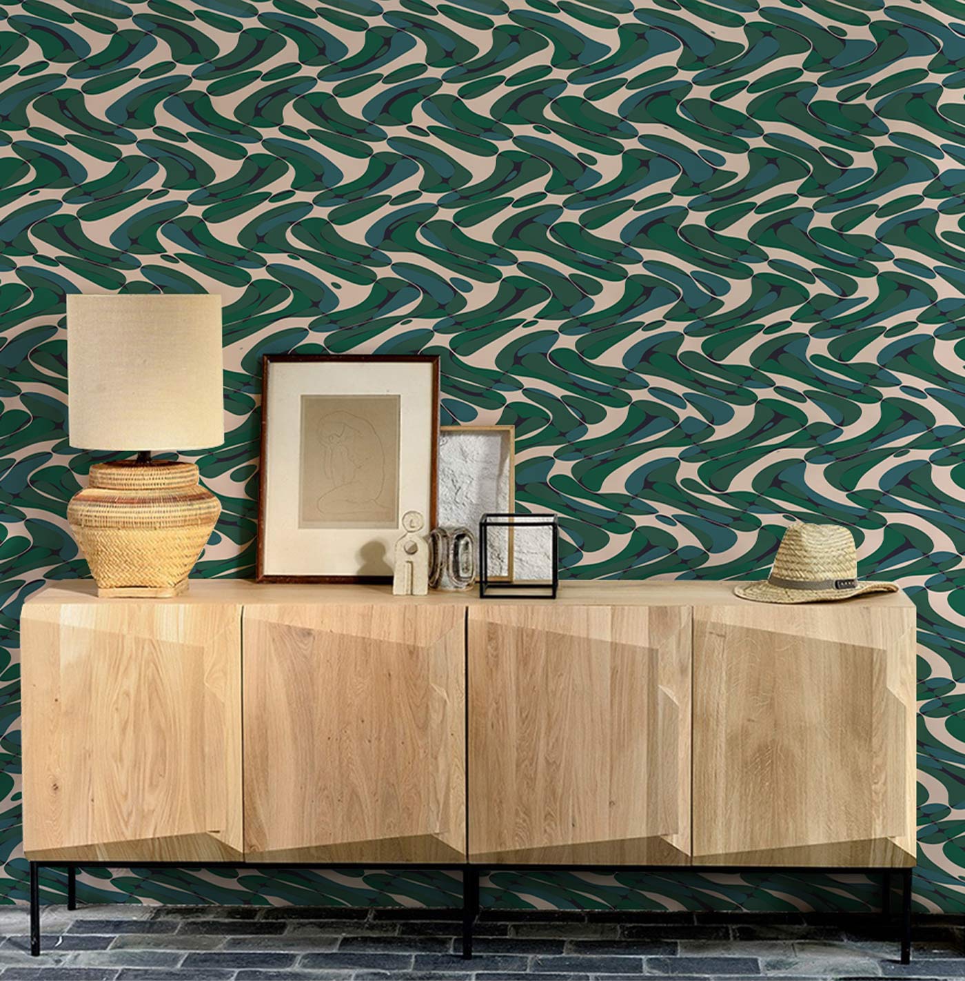 The Twisted Circle Wallpaper Mural exudes an artistic flair with its rhythmic interplay of swirling patterns. This design layers lush greens upon a soothing cream backdrop, evoking both movement and tranquillity. Perfect for spaces seeking a touch of artful sophistication, its textured appearance brings a unique depth to any room.