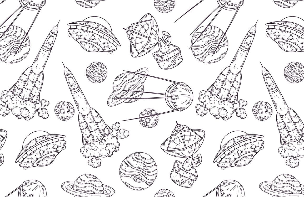 Introducing the Uncolored Space Sketches II Wallpaper Mural, a sophisticated tapestry of celestial illustrations that gracefully weaves together the mystique of the cosmos with monochromatic artistry. This mural features intricately drawn rockets, planets, and satellites, evoking a sense of endless exploration. Its refined simplicity and elegant design bring an air of modernity and timeless appeal to any room, making it a striking choice for those seeking to add a touch of the universe's wonder to their interior spaces.