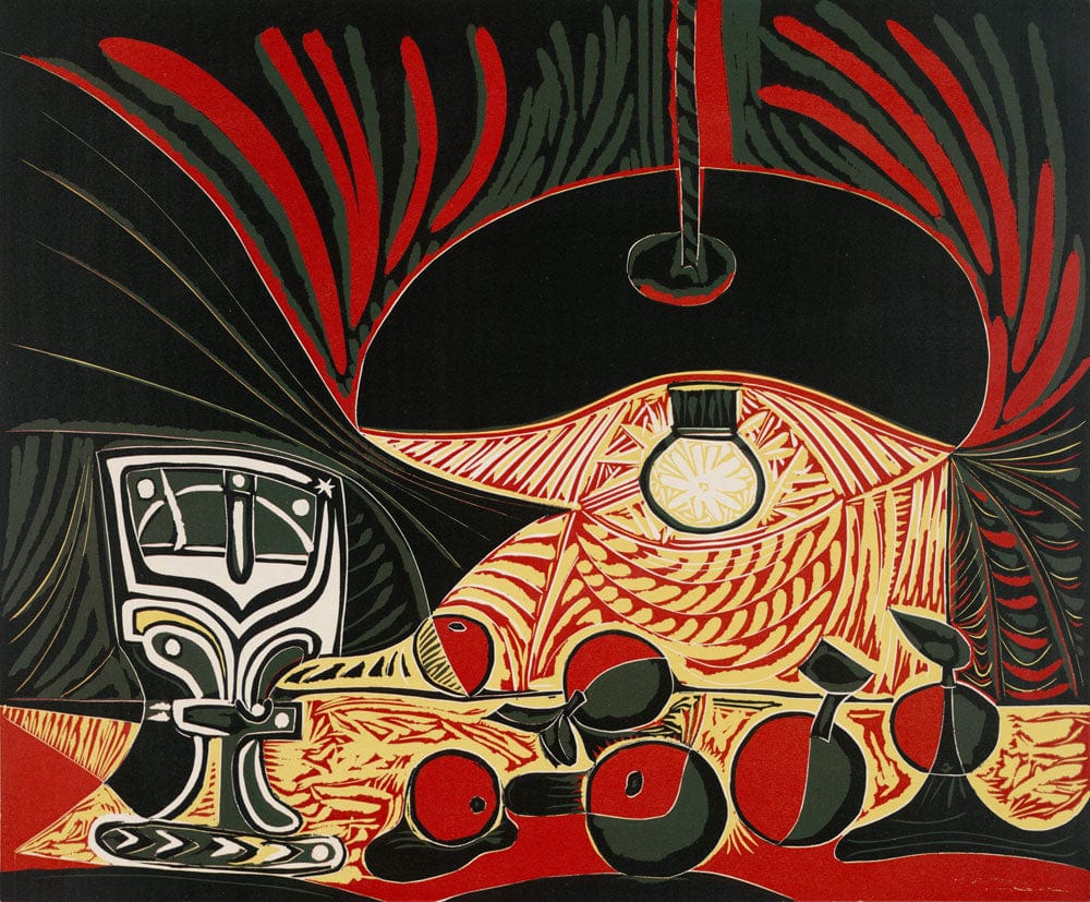Under The Lamp Wallpaper Mural exudes artistic flair with its dynamic interplay of rich blacks, vibrant reds, and warm yellows. It captures a captivating scene where a glowing lamp illuminates a sophisticated still life of glassware and abstract forms. The mural's intricate detailing and bold use of colour invite an atmosphere of refined elegance into any room, creating a stunning backdrop for both contemporary and vintage interiors.