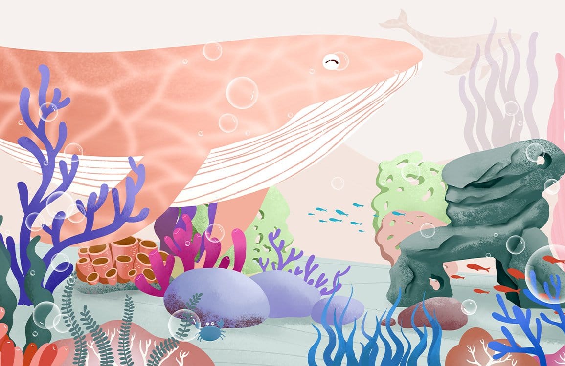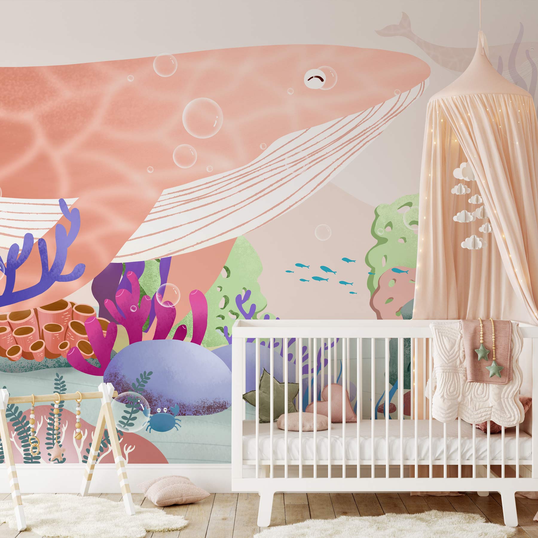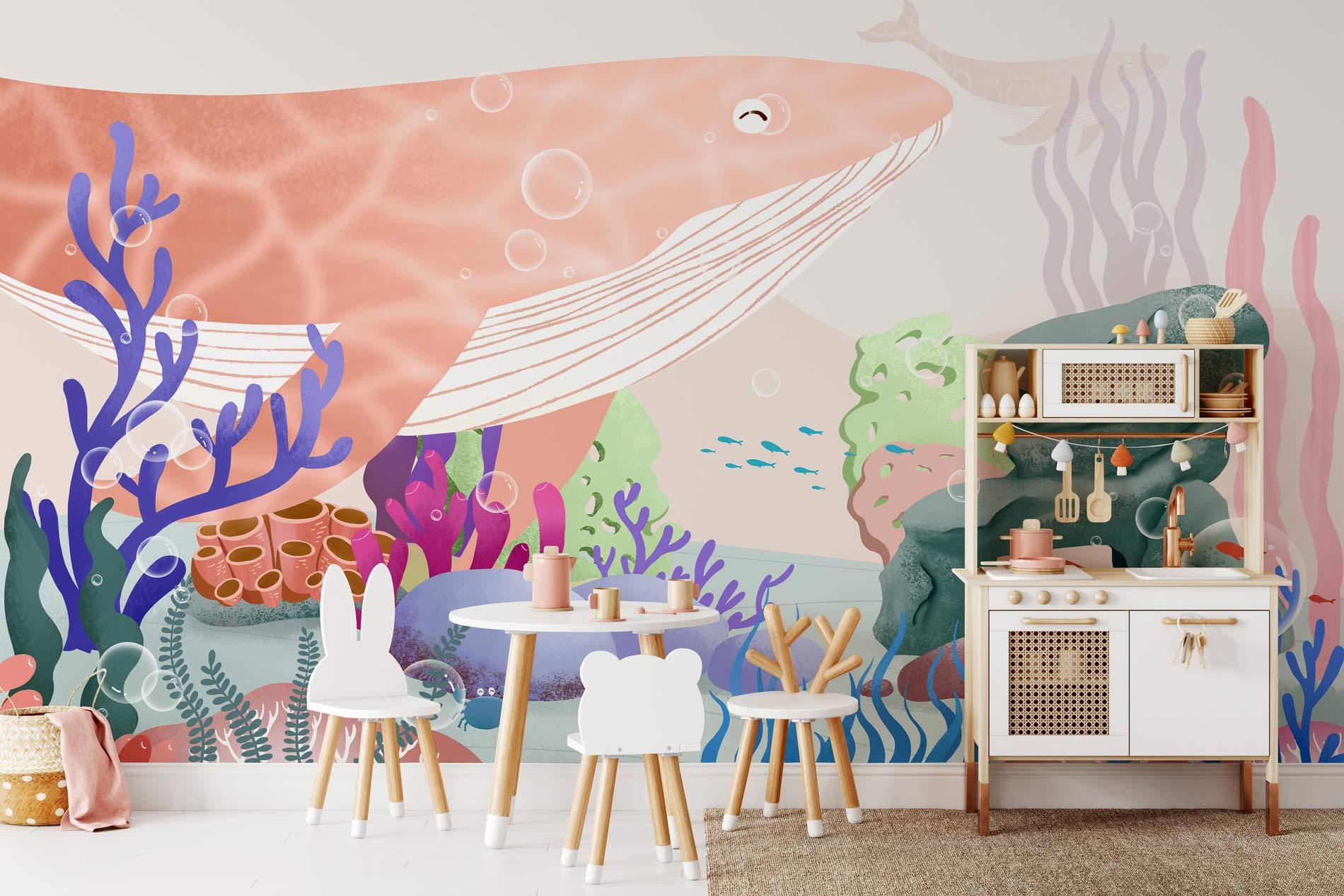 Explore the amazing world under the sea with this wallpaper mural. Your kids are going to love it! This wallpaper mural featuring a beautiful scene of hand-drawn sea animal creatures such as pink whales and colourful corals, will surely revamp your space! Great wallpaper for kids bedroom and playroom.