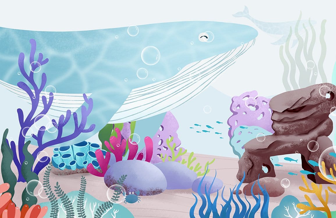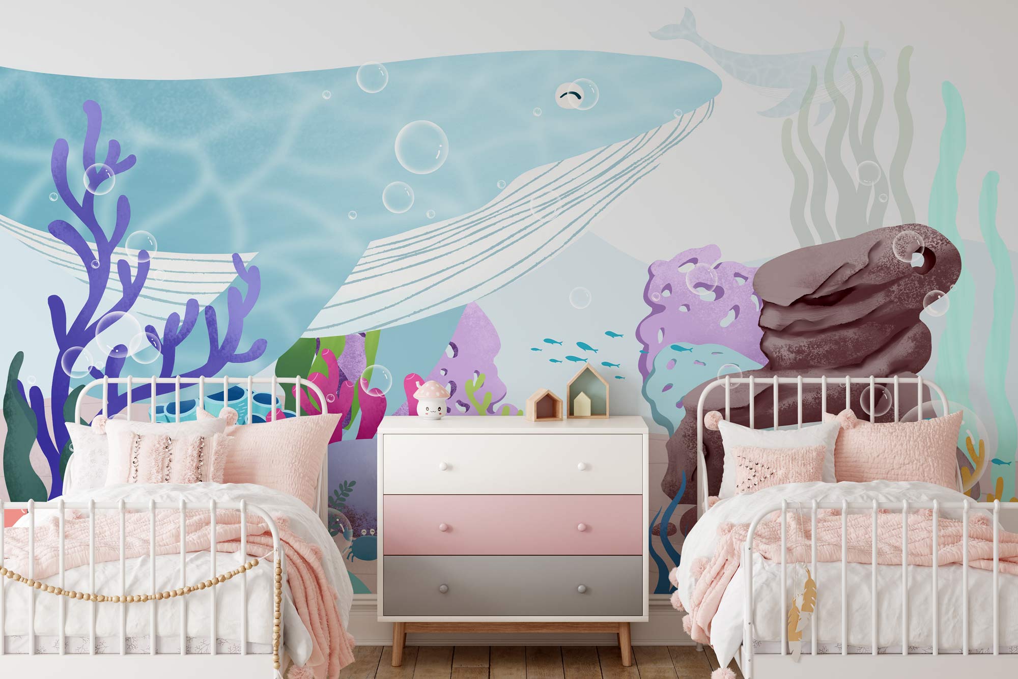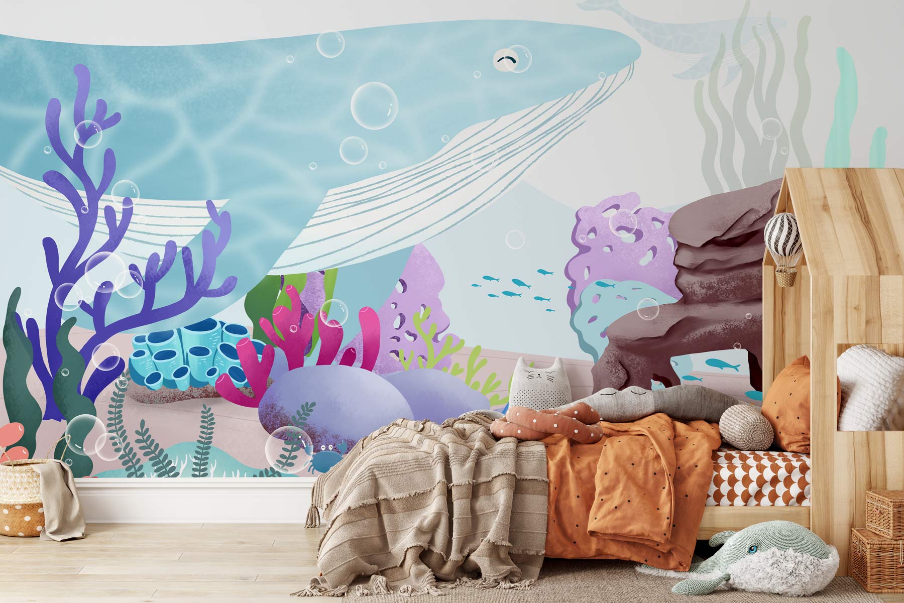Explore the amazing world under the sea with this wallpaper mural. Your kids are going to love it! This wallpaper mural featuring a beautiful scene of hand-drawn sea animal creatures such as blue whales and colourful corals, will surely revamp your space! Great wallpaper for kids bedroom and playroom.