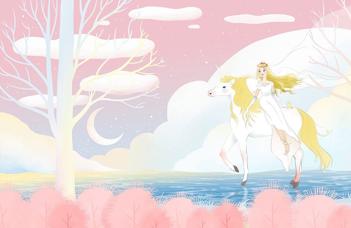 Experience the whimsical allure of the Unicorn & Princess Wallpaper Mural, where a serene landscape unfolds a tale of elegance and fantasy. Graceful strokes bring to life an enchanting scene of a crowned princess riding a majestic unicorn, set against a blush pink sky adorned with dreamy clouds. This mural's intricate detailing and refined artistry create a captivating backdrop, harmoniously blending into both classic and modern interiors, offering a timeless ambiance.