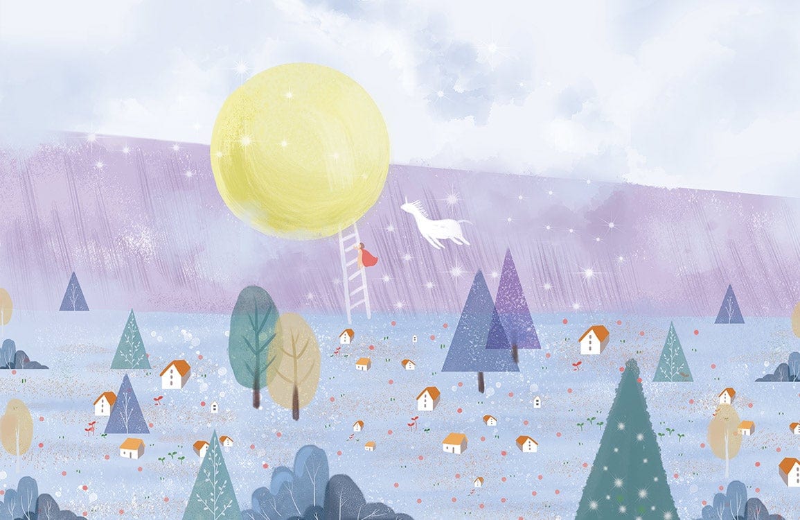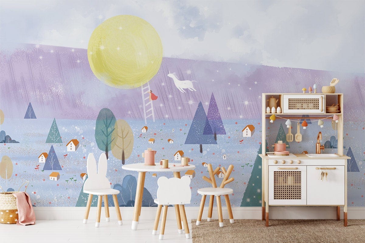 Enter a whimsical world with the Unicorn Dreamy Land Wallpaper Mural, where a serene landscape unfolds under a lilac sky. The delicate interplay of soft blues and lush greens sets a tranquil scene, dotted with quaint cottages and enchanting trees. A graceful unicorn ascends a ladder to a glowing moon, adding a touch of magic that captures the imagination. Ideal for both classic and contemporary spaces, this mural effortlessly melds fantasy with elegance, creating a captivating ambience.
