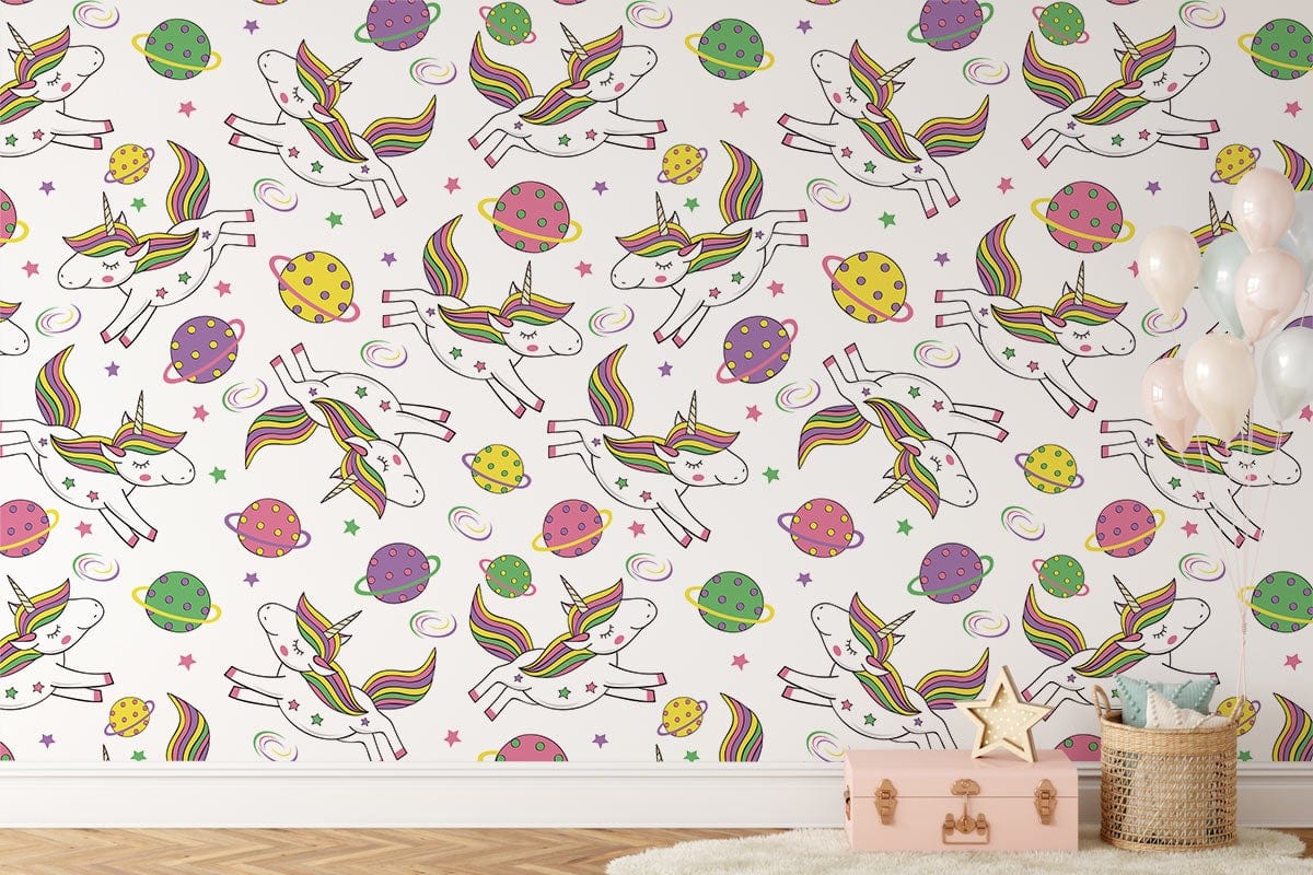 Dive into a whimsical realm with the Unicorn & Planet Wallpaper Mural, where vibrant unicorns prance amidst a celestial dance of colourful planets. This enchanting design brings a playful yet sophisticated flair, perfect for adding a touch of magic to any room. The intricate details and harmonious colour palette create a captivating and timeless feature, effortlessly suitable for an array of interior styles.