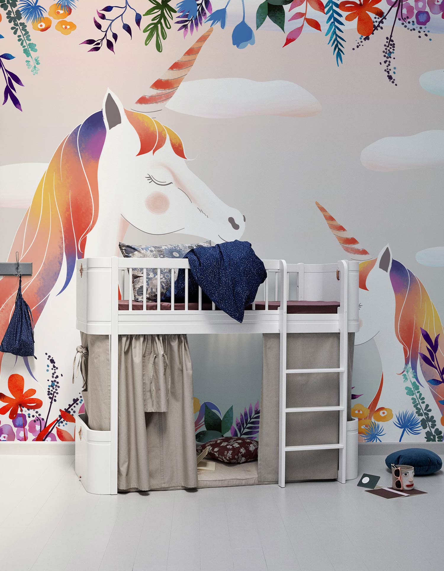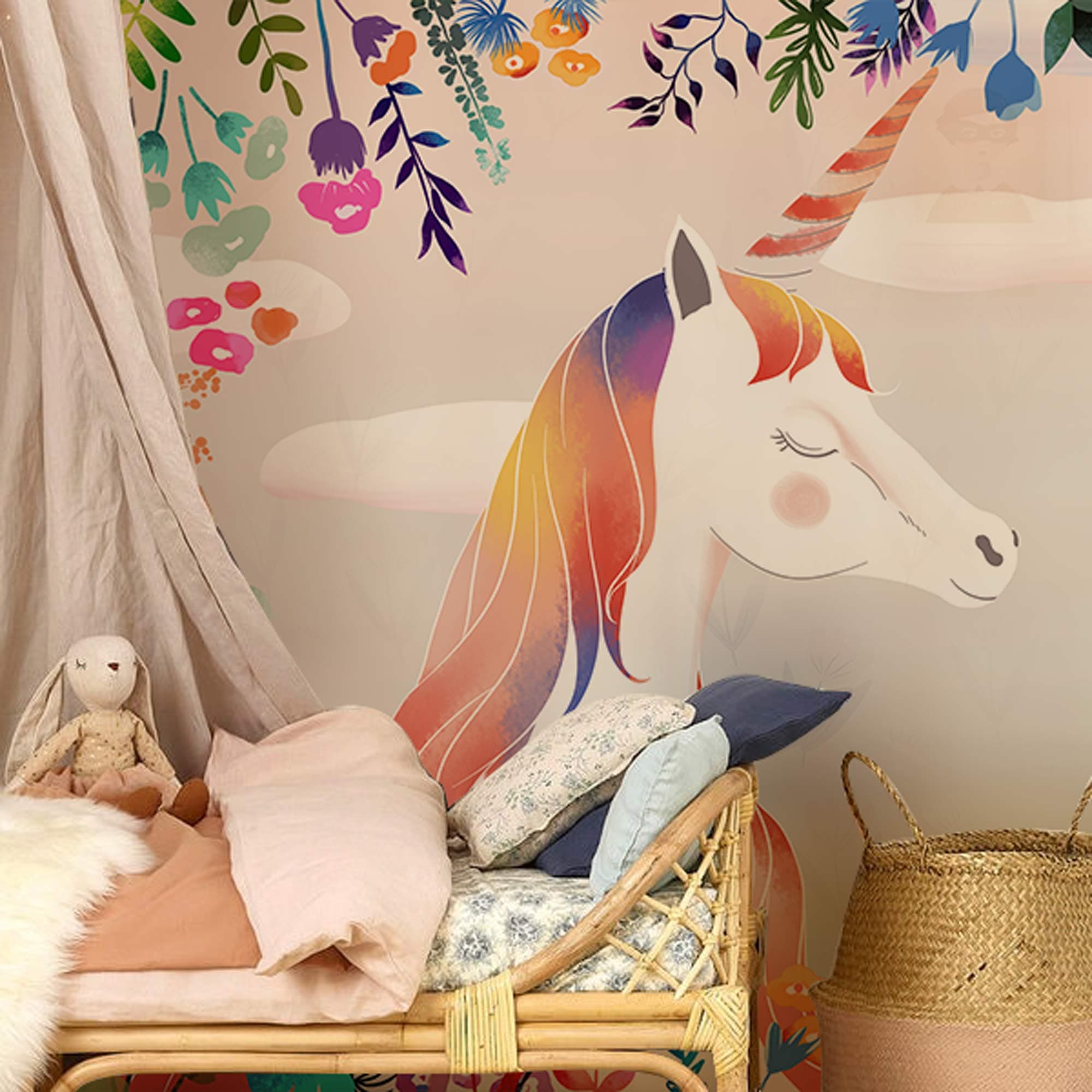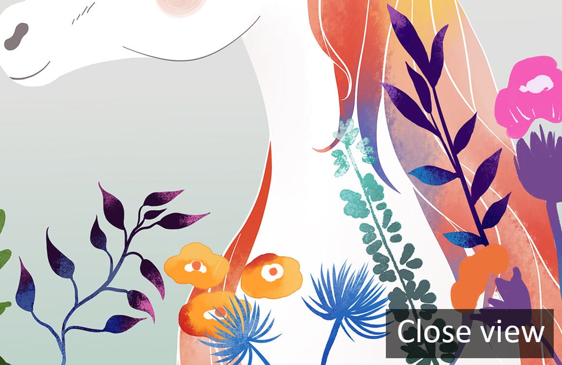 The Dreamy Unicorns Wallpaper Mural brings a whimsical elegance to any room. Featuring delicate unicorn illustrations surrounded by vibrant floral motifs, this mural creates a serene and enchanting environment. The harmonious interplay of vibrant hues against a soft background conveys a sense of wonder and sophistication, making it an ideal choice for diverse interior settings.