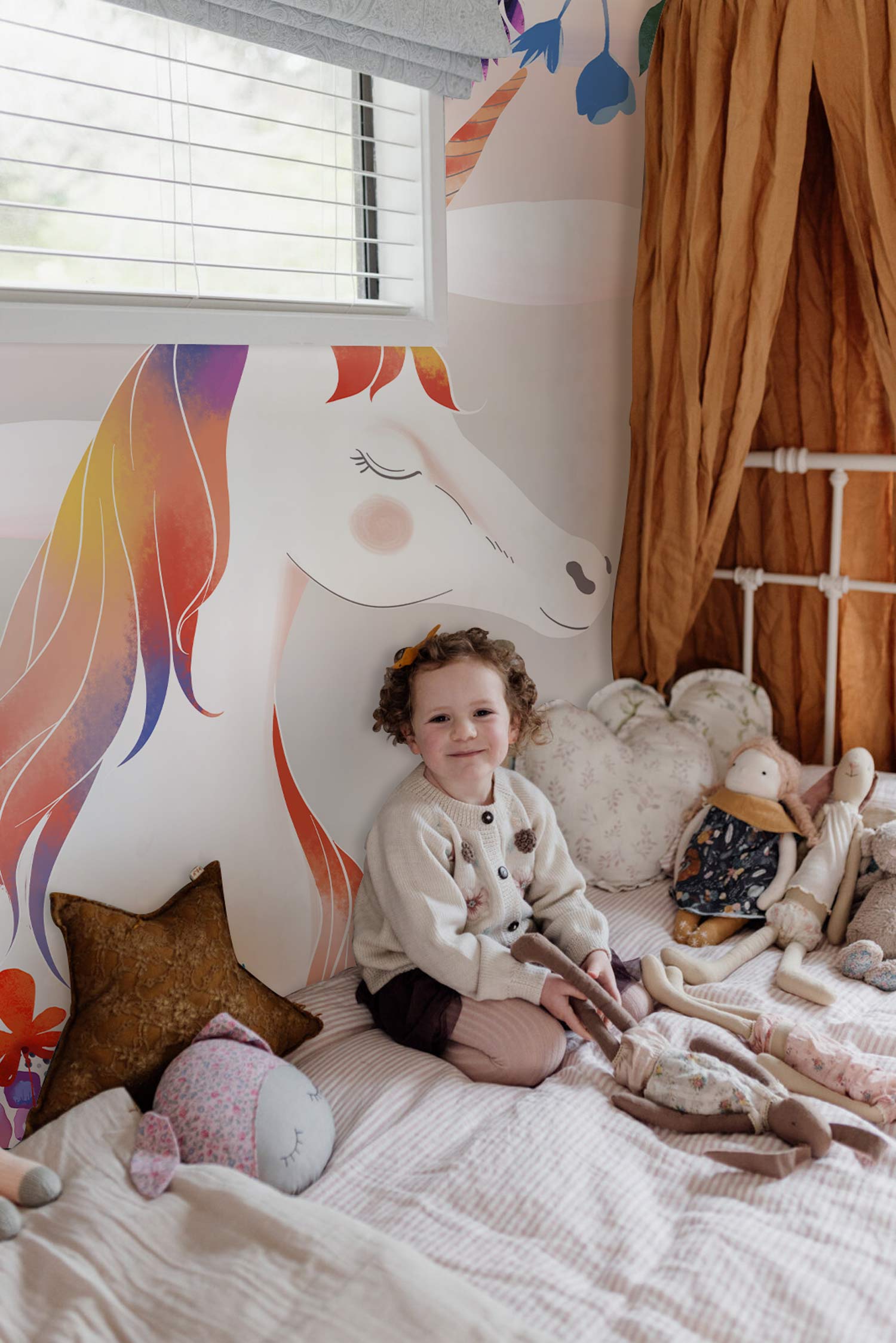 Take a look at this adorable unicorn wallpaper mural. Painted with soft dreamy tones that will be perfect for your kids room and nursery. Place this wallpaper on the wall that is next to their bed and enjoy the peaceful feeling it brings to you and your children.