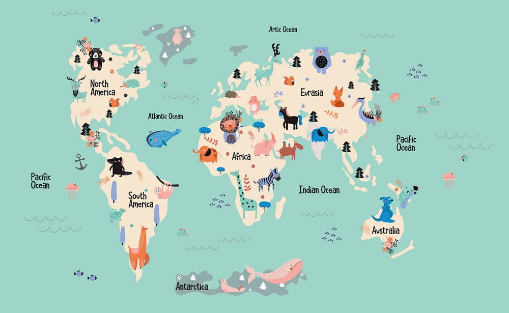 Showcasing an enchanting world teeming with whimsical wildlife, this Unique Animal Map Wallpaper Mural captivates the imagination. Each continent is delicately illustrated with charming animals, creating a lively yet sophisticated tapestry of the natural world. The serene pastel background juxtaposes with vibrant creatures, offering an artistic flair that harmonises with both contemporary and classic interiors.