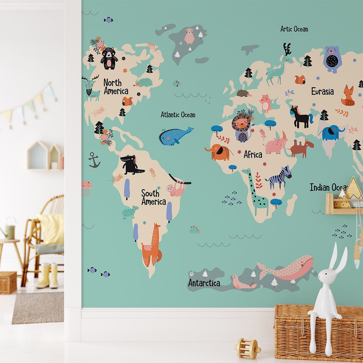 Make your child's room, playroom, and nursery into an amazing adventure with the Cool Animal Map Wallpaper Mural. The vibrant, colourful animals come together in this mural to create a trendy and stylish focal point that kids will love. The map design features various animals from all over the world, which make for a fun time-traveling journey for your little one. Children will love looking at it and discovering where each animal lives in the world through this exciting animal wallpaper.