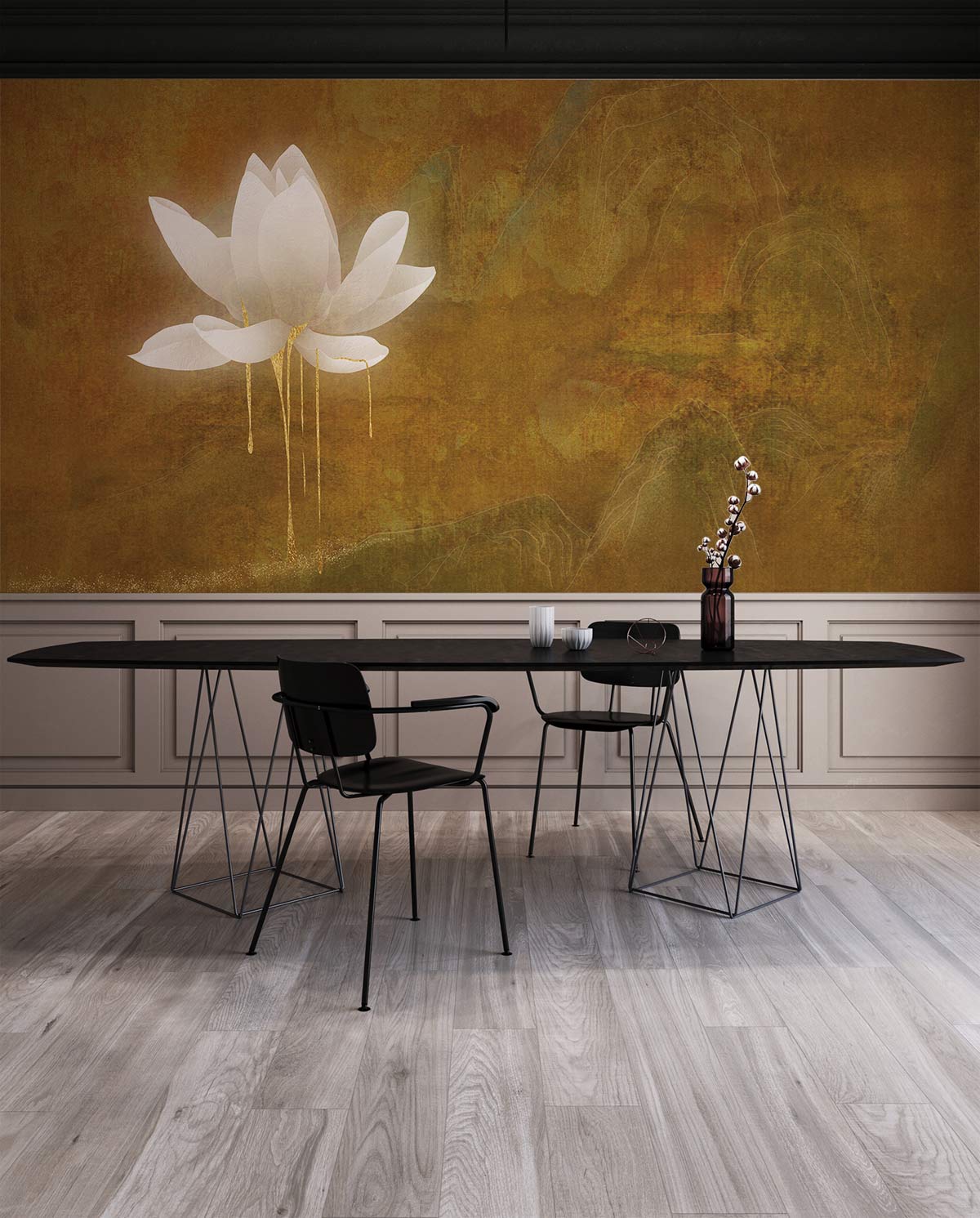 This Gold Plated Lotus Wallpaper Mural embodies the serene elegance of a timeless lotus motif, beautifully rendered with a shimmering golden touch. The delicate interplay of light and shadow captures the ethereal essence of the lotus, while the rich textures and intricate details create an exquisite focal point in any room. Ideal for settings that favour sophistication and tranquility, this mural harmonises effortlessly with various interior designs.
