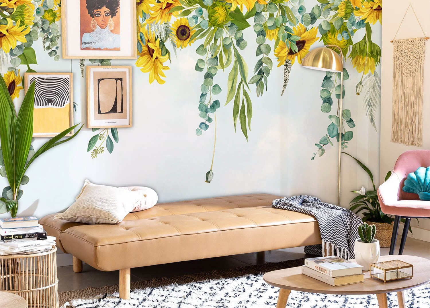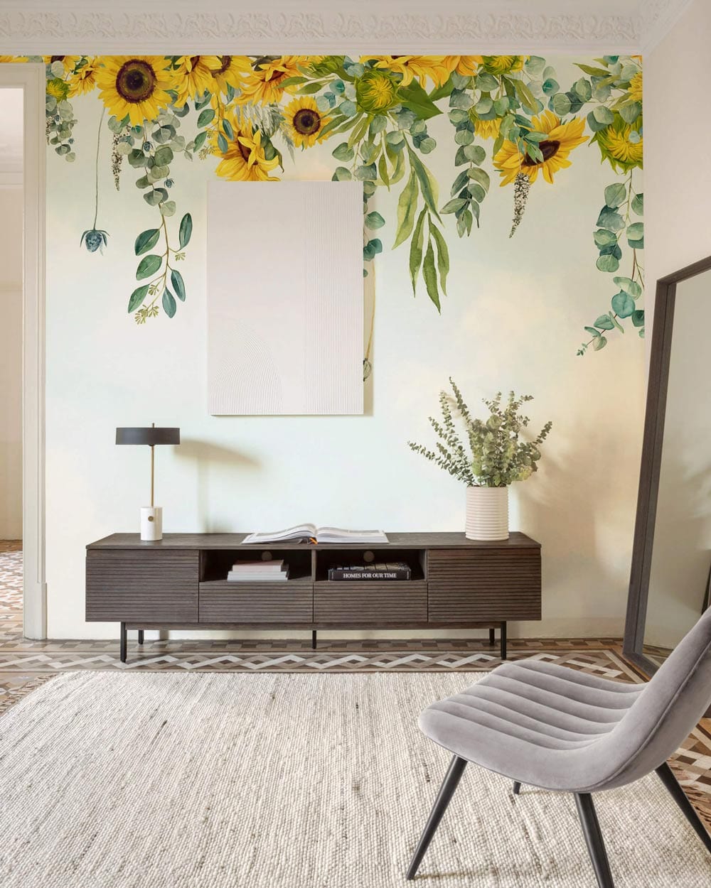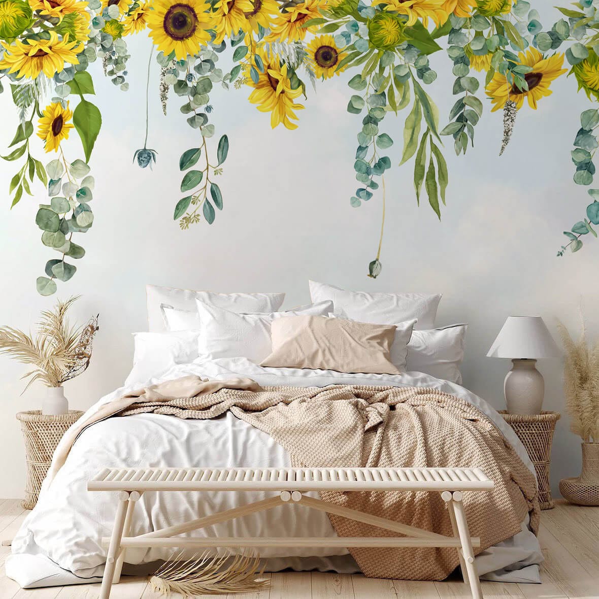 Immerse your space in a serene blend of nature with the Upside Sunflower Wallpaper Mural. This design features vibrant sunflowers cascading gracefully against a soft sky, creating a harmonious and lively atmosphere. Perfect for adding a touch of elegance and warmth, this mural seamlessly integrates with various interiors, from rustic charm to contemporary settings.