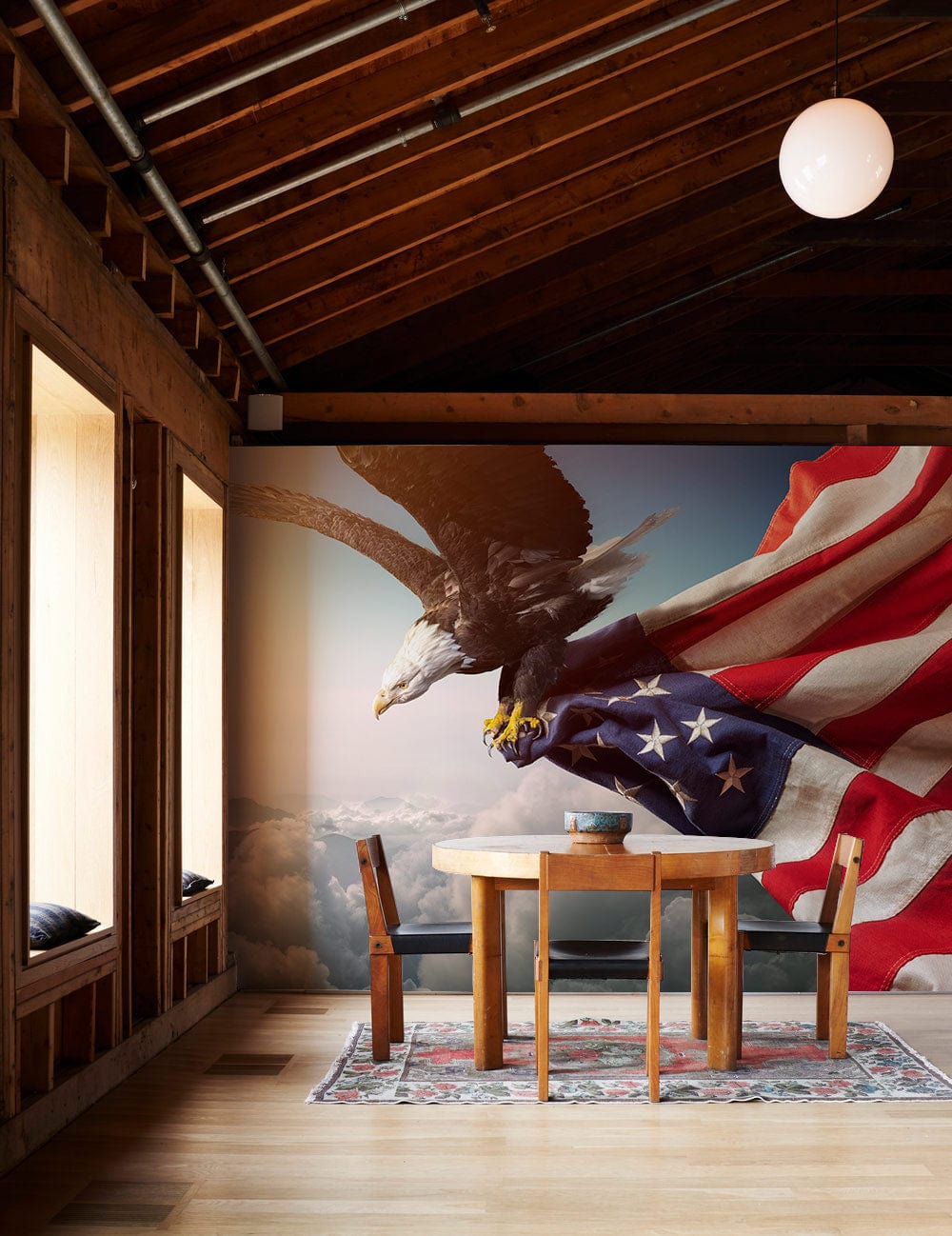 The USA Eagle Wallpaper Mural captures the majestic flight of the eagle against a dramatic sky, entwined with the fabric of the American flag. Rich in texture and narrative, this artwork brings both patriotic pride and a sense of vast open skies to your interior. Its sophisticated composition seamlessly fits diverse spaces, offering a powerful statement that is as timeless as it is iconic.