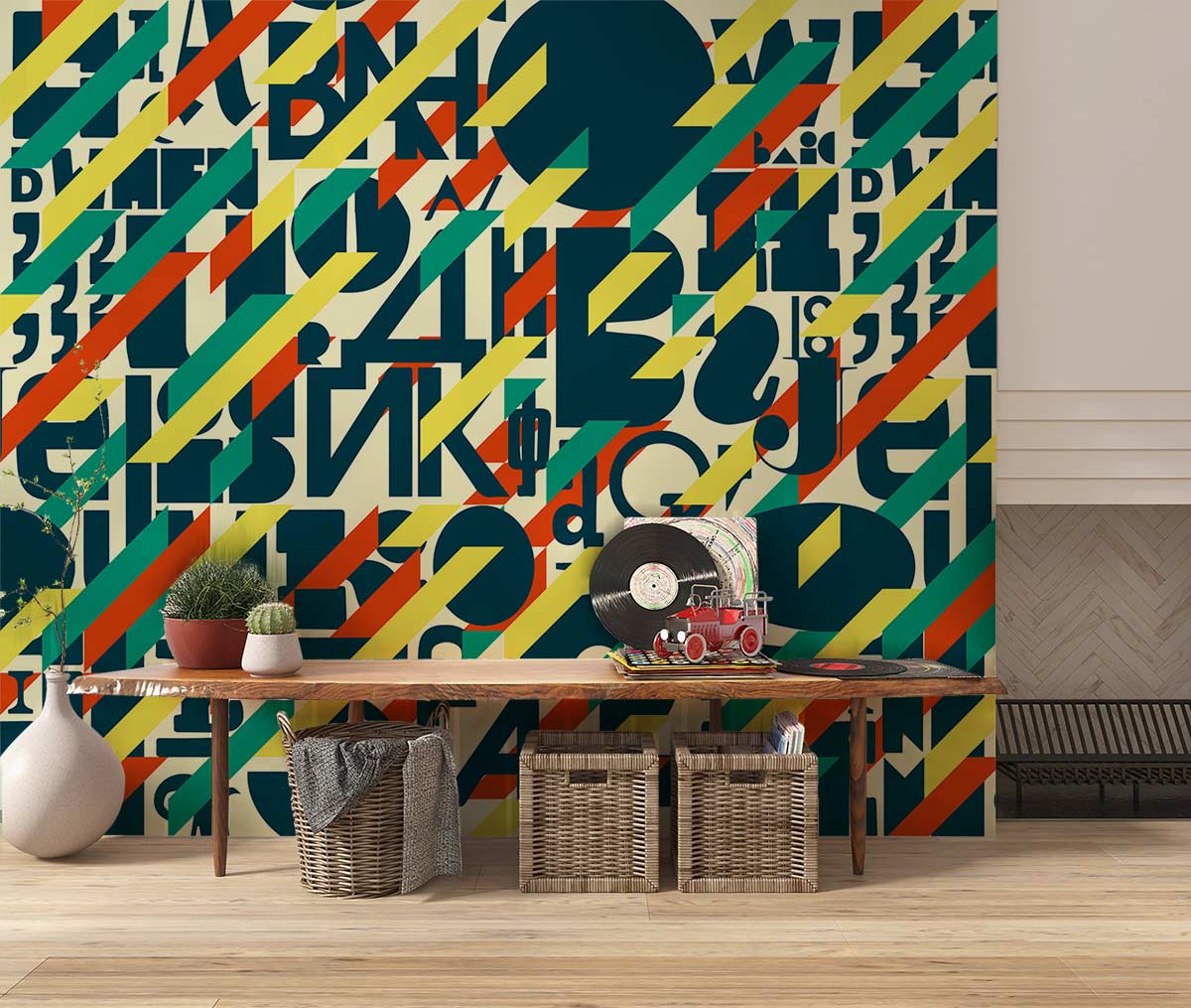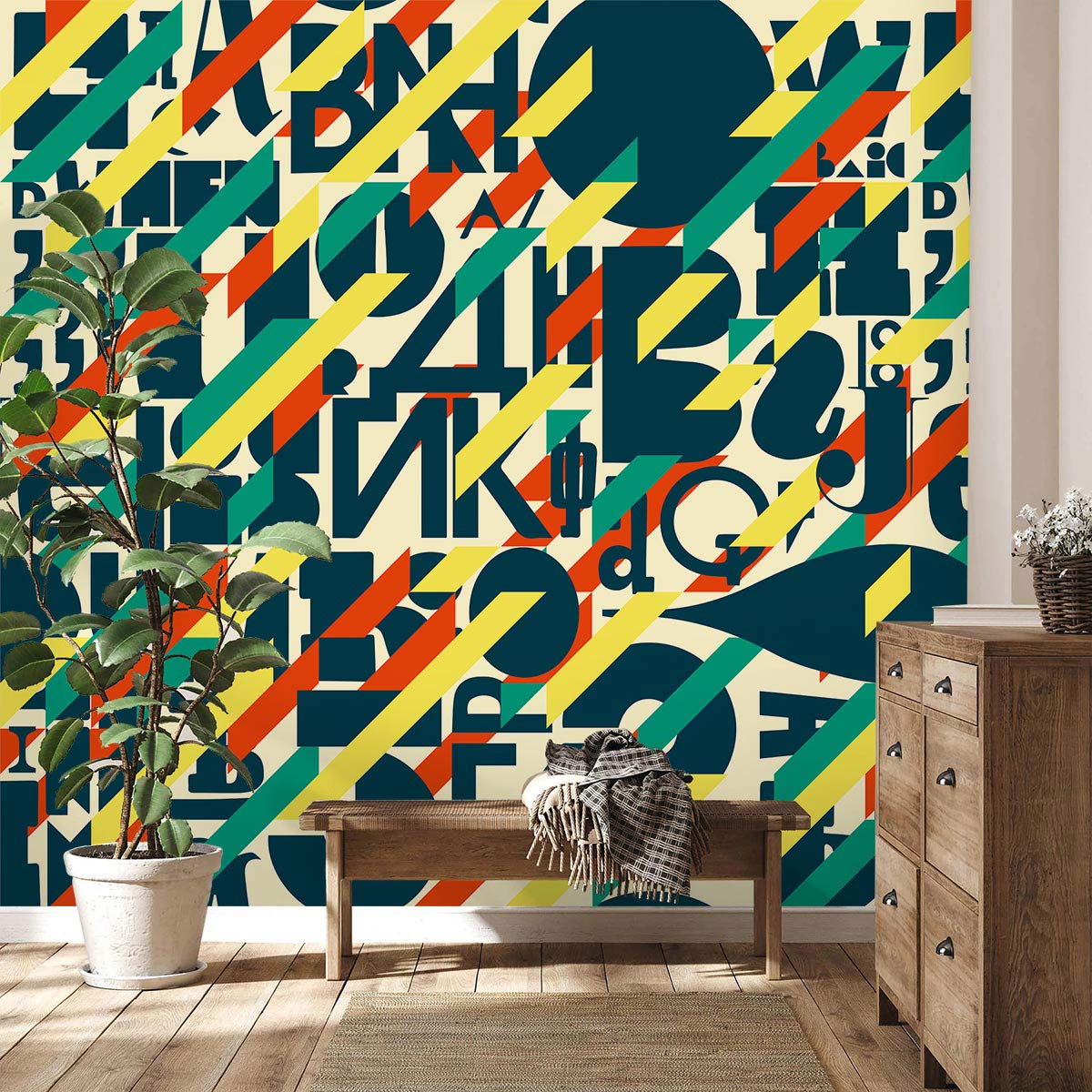 Immerse your space in a symphony of abstract letterforms with the Vague Letters Wallpaper Mural, where geometric patterns interlace with vibrant hues. The design echoes a modern artistic flair, seamlessly integrating letters into a dynamic tapestry that speaks sophistication in every glance. This mural offers an elegant backdrop suitable for spaces that celebrate both style and intellect.