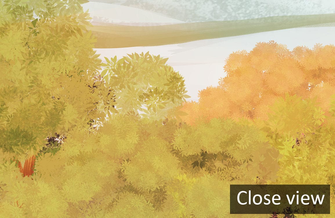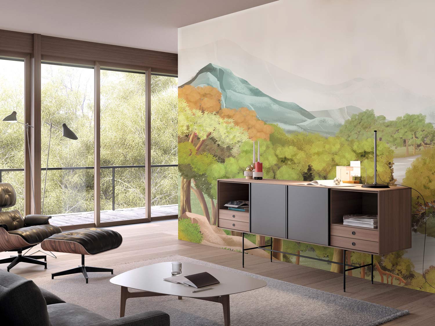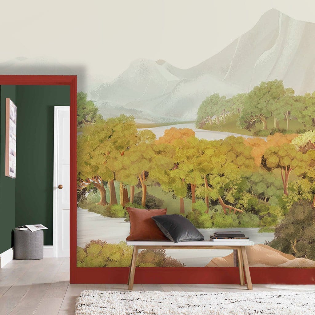 Forest Valley II Wallpaper Mural captures a serene landscape with gently rolling hills and lush greenery, evoking a sense of tranquillity and natural beauty. Its elegant depiction of verdant trees, crossed by a meandering river, seamlessly merges art with nature. This mural brings the outdoors inside, creating a peaceful refuge suitable for a wide range of interiors.