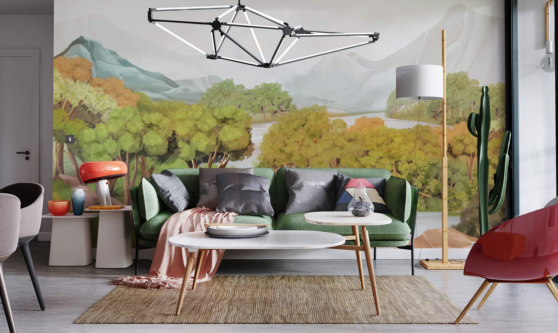 Escape into the forest valley with this stunning wallpaper mural. This colourful green forest-themed wall mural will surely bring your home a fresh appeal. It creates a lively and energetic atmosphere for your living room or your child's room. Now, prepare to splash some colours to your wall and revamp your space!