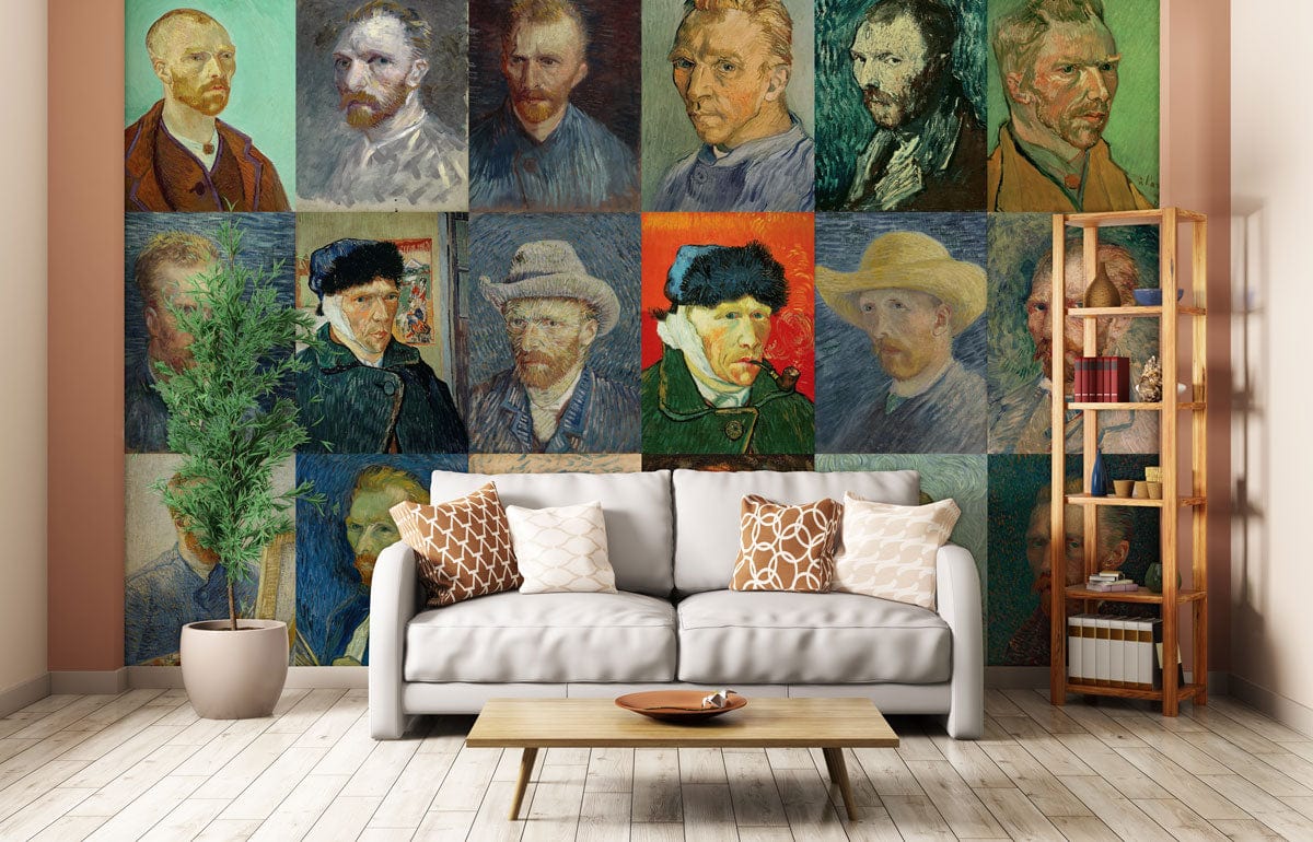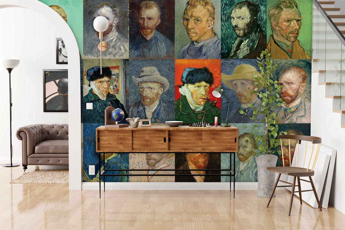 Immerse your space in the profound artistry of Van Gogh with this exquisite wallpaper mural. Showcasing a masterful collection of his iconic self-portraits, the mural blends historical richness with vibrant detail. Each brushstroke comes alive, capturing Van Gogh's evocative style, seamlessly integrating into diverse settings from modern to eclectic interiors.