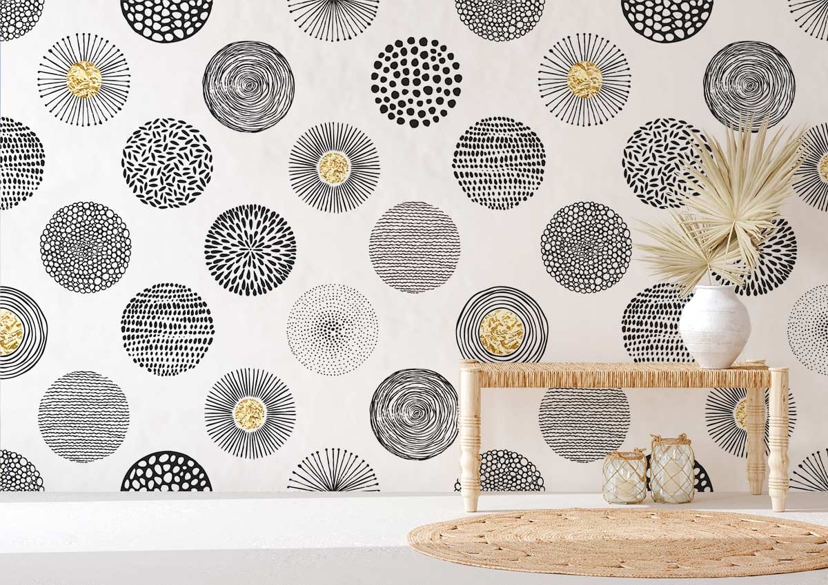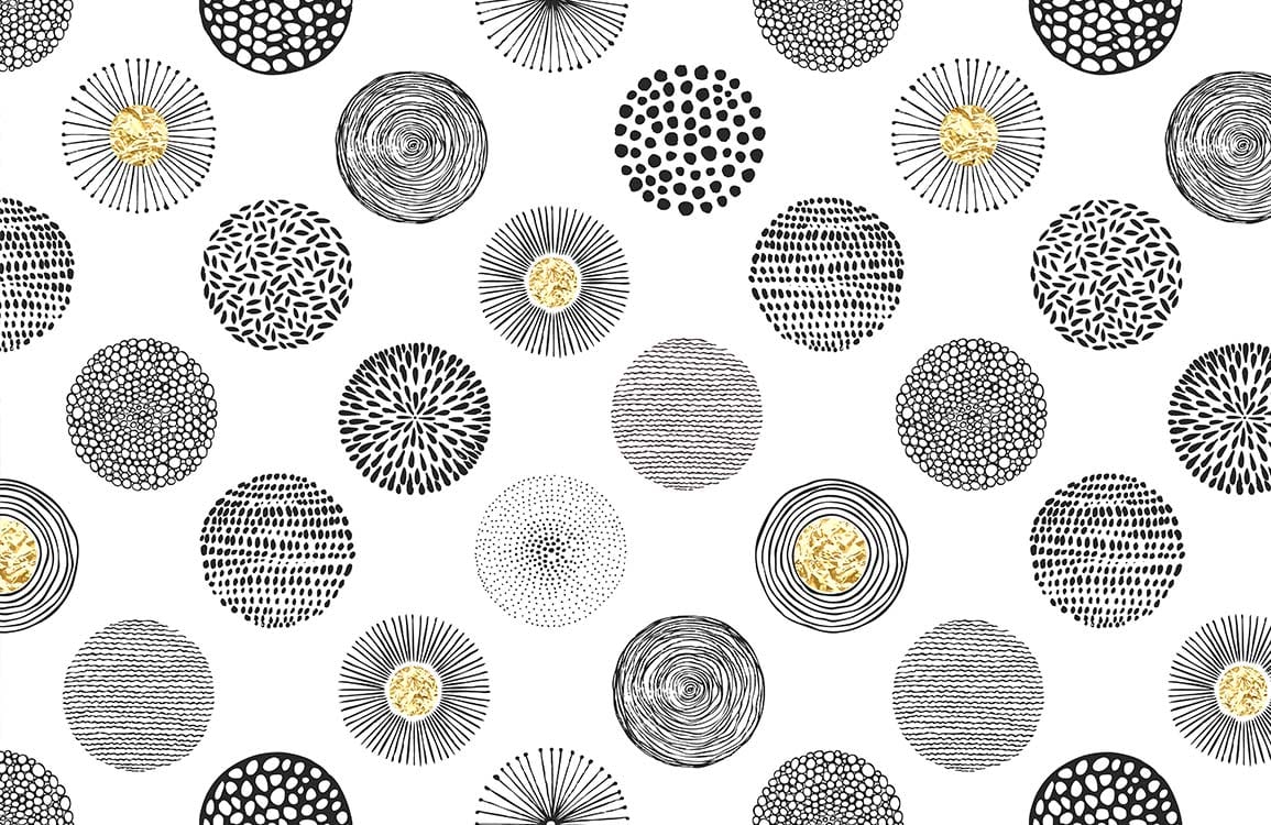 Immerse your space with the Varies Circles II Wallpaper Mural, an intriguing blend of geometric artistry and subtle sophistication. This mural features an array of meticulously detailed circles, each one unique in design, creating a harmonious dance across your walls. The intricate patterns in monochrome hues are elegantly punctuated by hints of gold, offering a timeless ambience that complements both traditional and contemporary interiors.