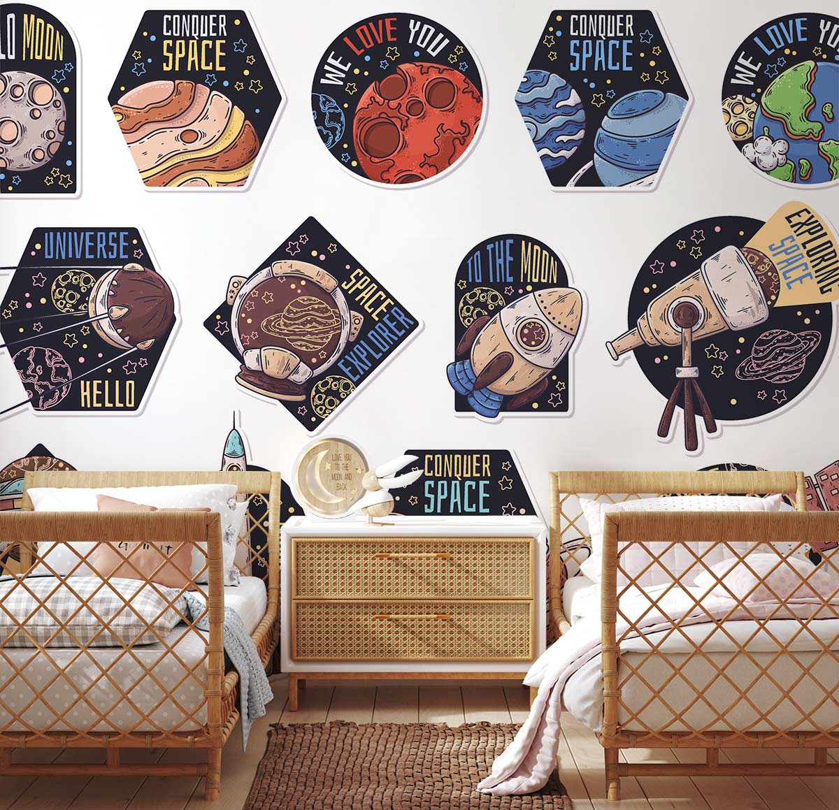 Step into a cosmic journey with the Varies Space Shapes Wallpaper Mural, featuring intricately designed celestial motifs and planetary elements. This mural weaves together rich, illustrative depictions of space exploration, capturing both the mystery and grandeur of the universe. Perfectly suited for spaces that crave an imaginative and cultured touch, its artistic nuances are tailored for an eclectic palate - offering a cosmopolitan flair that resonates with timeless elegance.