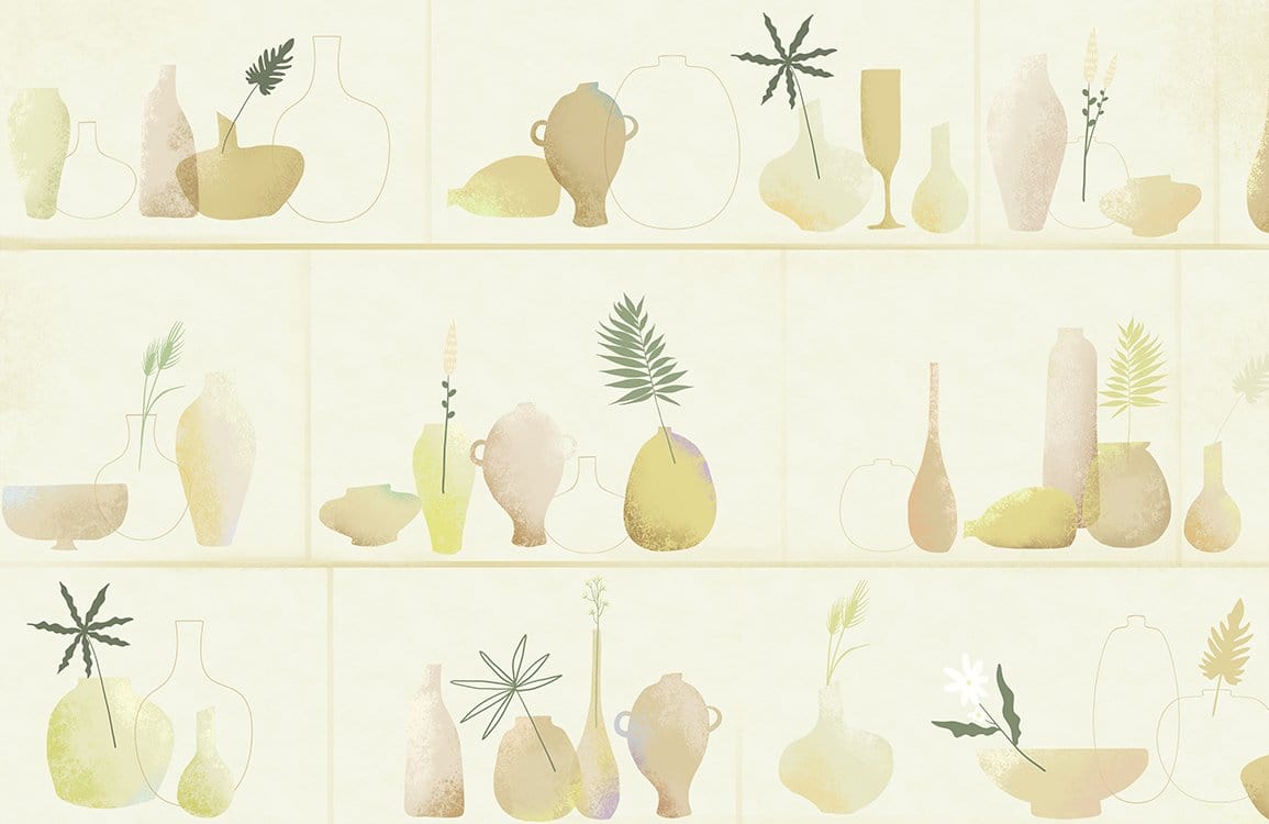 Immerse your space in a serene blend of artistry and nature with this Vase Wallpaper Mural. Its delicate portrayal of silhouetted vases and subtle foliage creates a harmonious interplay of shape and form. The muted pastel tones infuse an air of elegance, making it an exquisite backdrop for both classic and contemporary interiors.