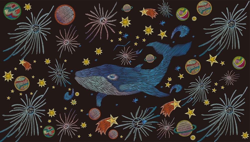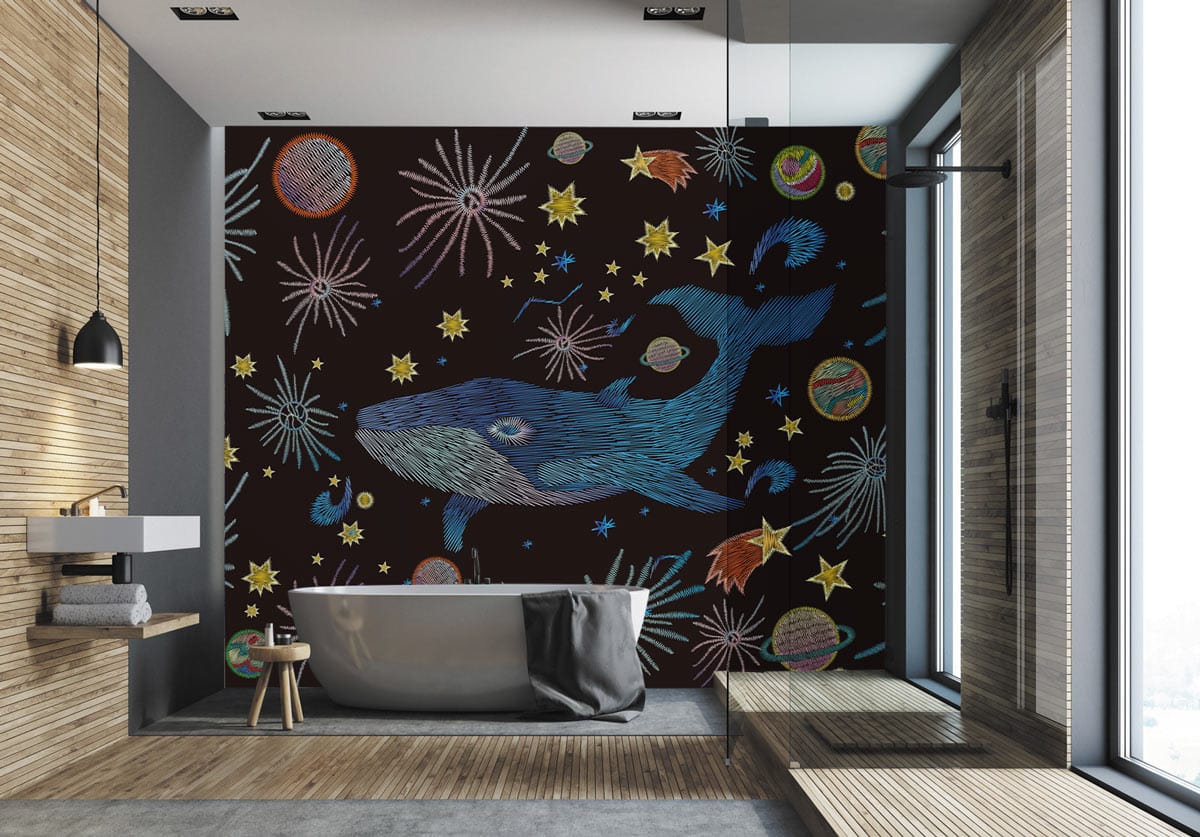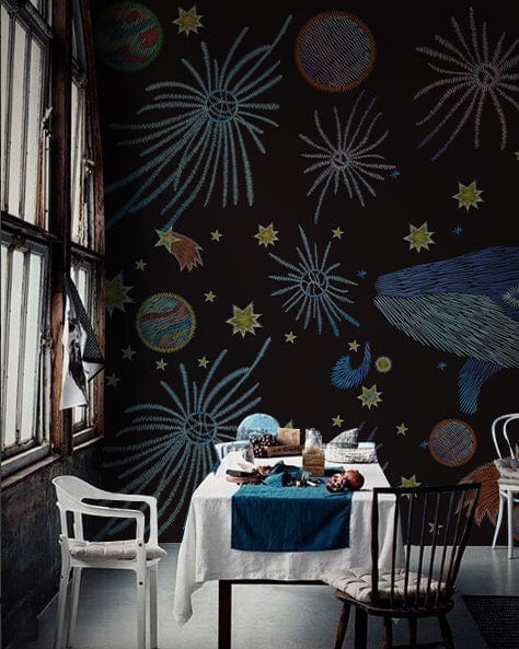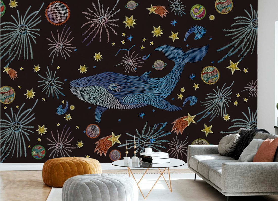 Immerse yourself in the aquatic majesty of this Vector Blue Whale Wallpaper Mural, where the delicately illustrated blue whale glides amidst an ethereal cosmos. The intricate patterns and celestial motifs evoke a sense of wonder, making it a timeless piece for various interior settings. Perfectly suited for those seeking to add a touch of the ocean's serenity and the universe's mystery to their space.