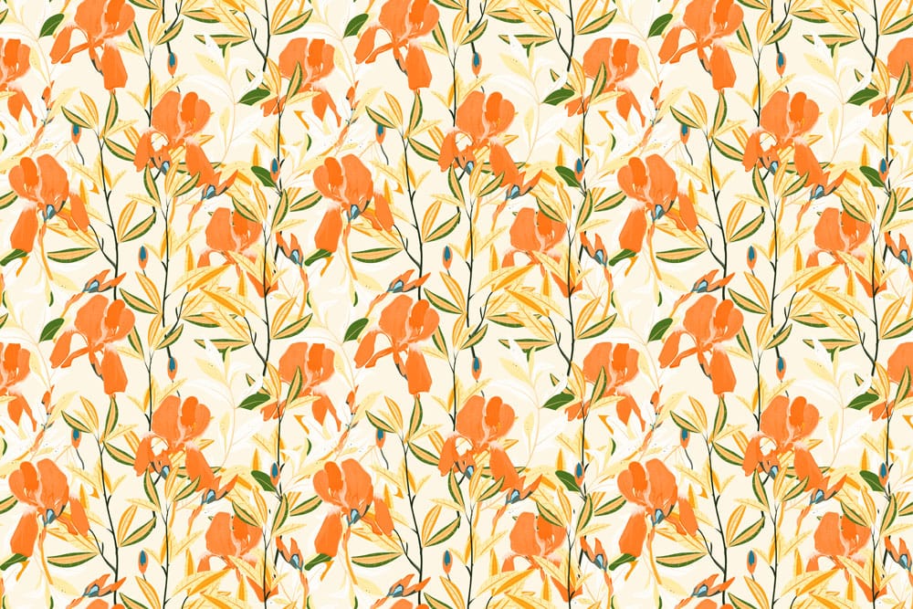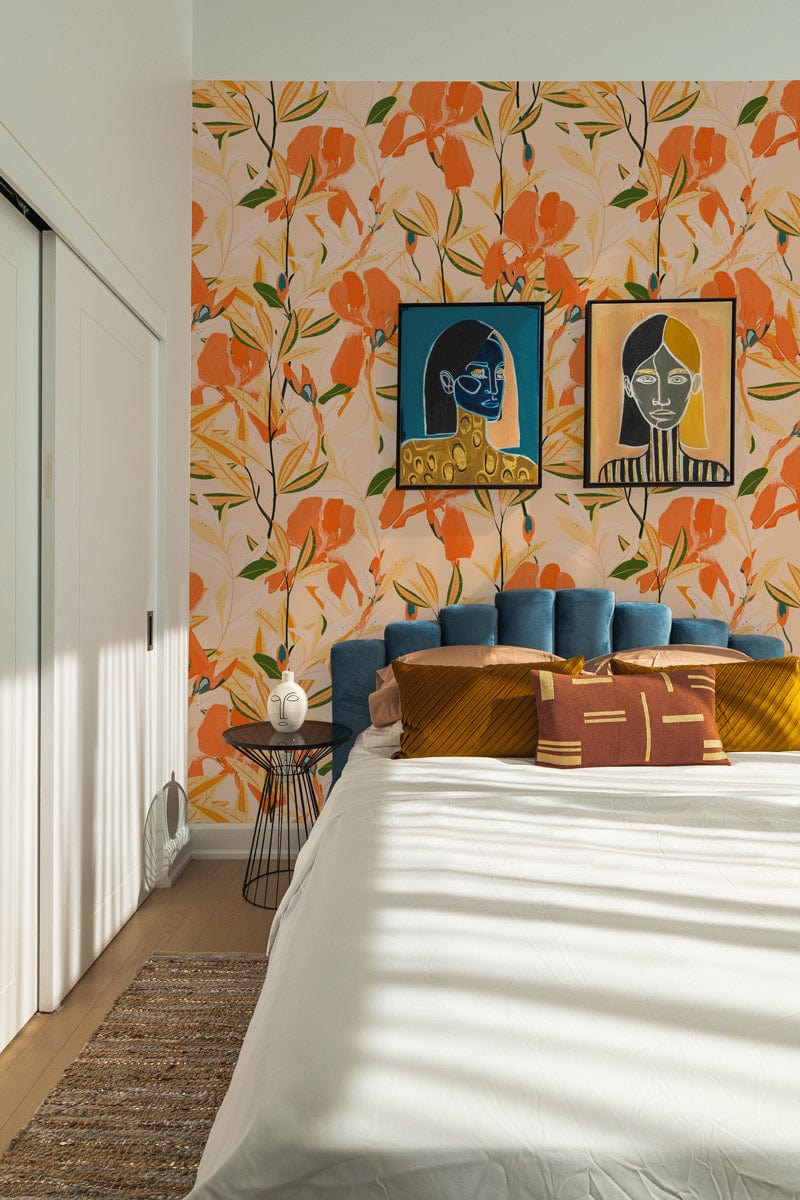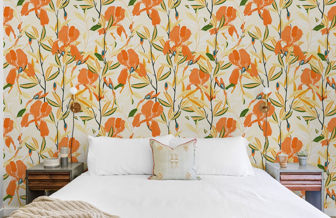 Immerse your space with the Vibrant Blooming Botanical Harmony Mural Wallpaper, where delicate floral designs intertwine with graceful leaves. The lively hues of orange and yellow dance across a soft ivory background, creating a striking visual symphony. This wallpaper brings a touch of nature's elegance into any setting, making it a versatile choice for diverse interiors, from a cosy living room to a serene bedroom.