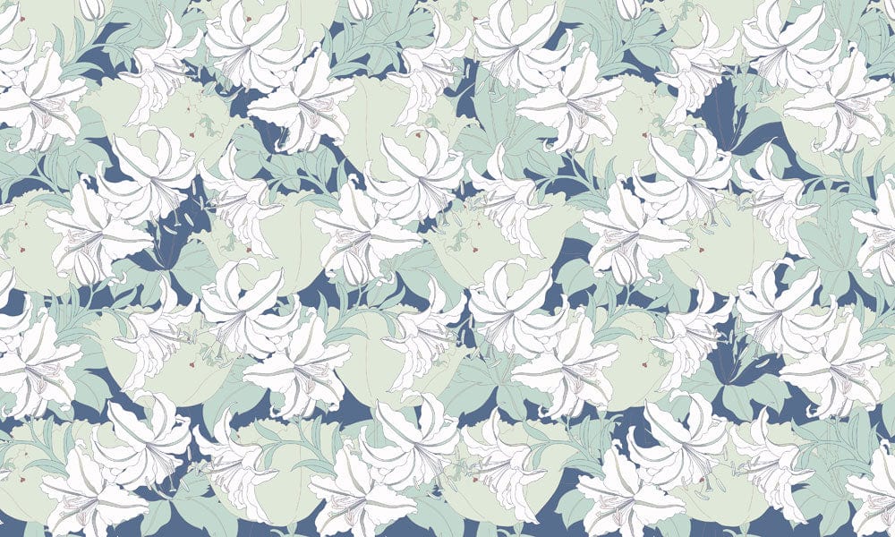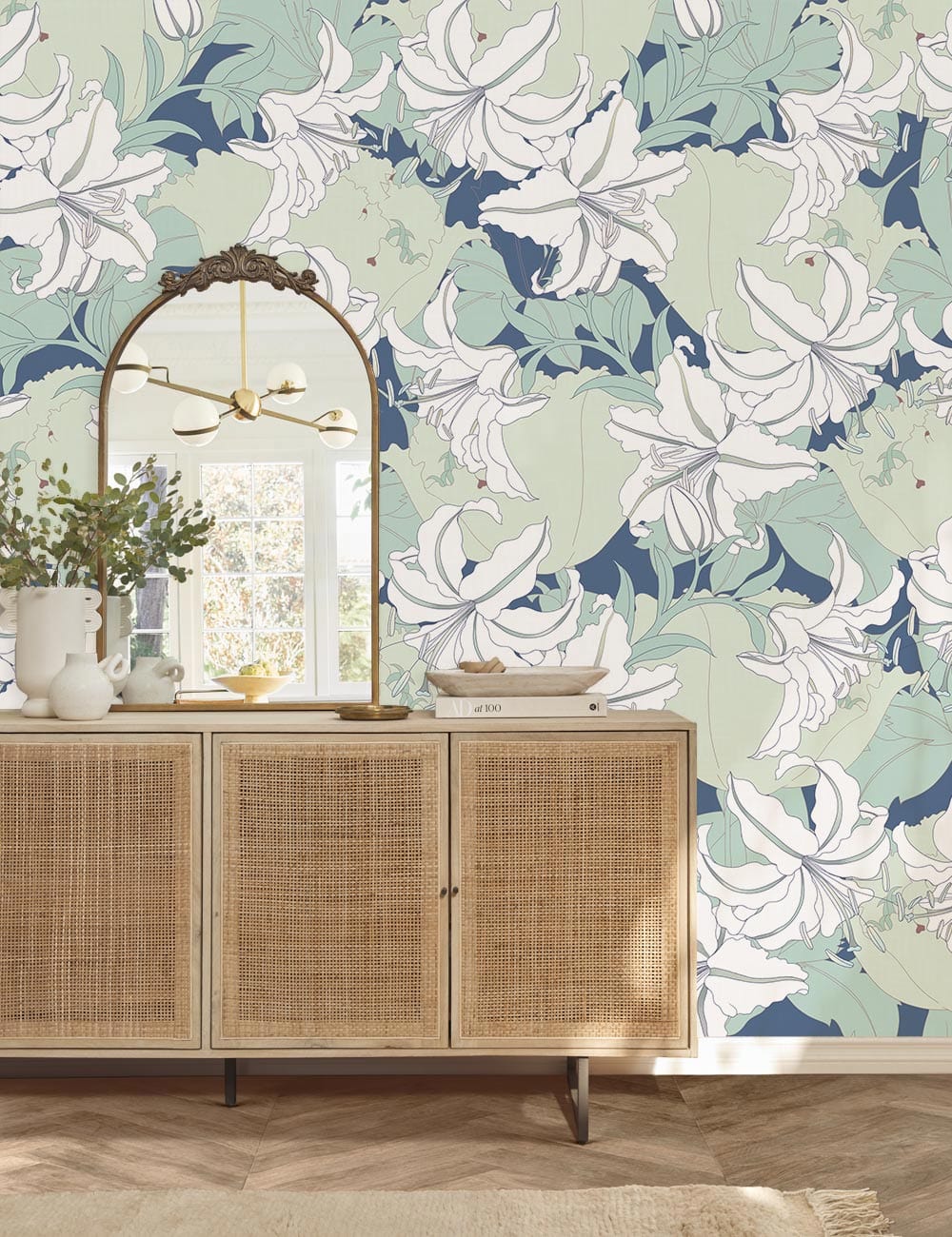 The Vibrant Lily Wallpaper Mural elegantly captures the beauty of nature with its exquisite depiction of lilies in full bloom. The intricate design showcases sweeping petals in soft white, set against a delicate blend of mint green foliage and deep navy accents. This mural brings a sense of sophistication and serenity to any space, making it an ideal choice for both contemporary and classic interiors.