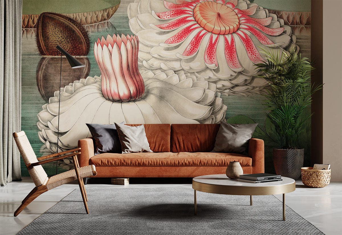 Victoria Rejia ll Wallpaper Mural invites you into a serene aquatic world, where delicately drawn water lilies float gracefully upon a tranquil blue background. The intricate layering of whites and soft pinks lends an artistic and natural elegance, seamlessly integrating into both traditional and contemporary spaces. With its harmonious blend of colours and textures, the mural brings a refined touch to any interior.