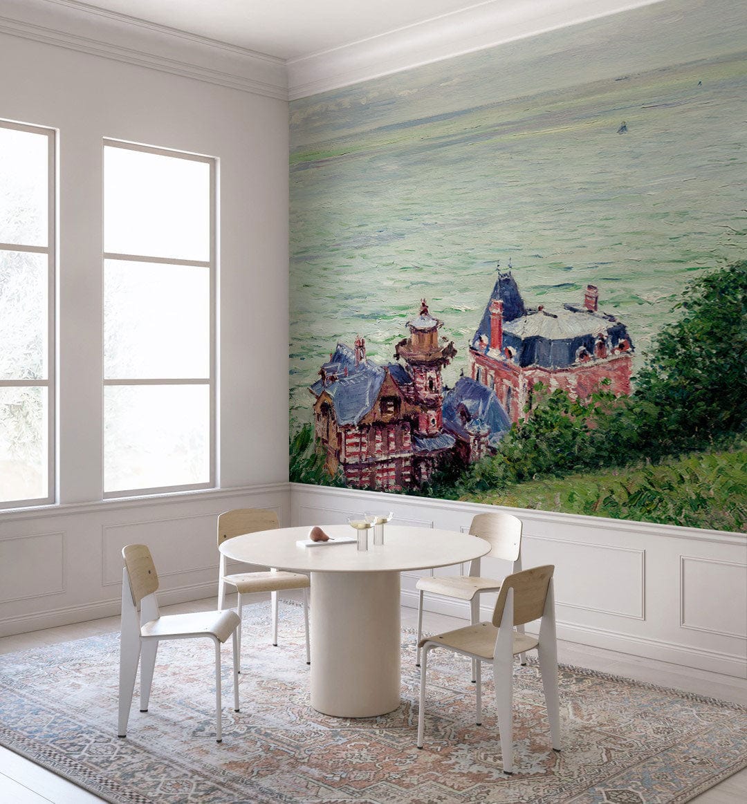Villas at Trouville Mural Wallpaper is a beautiful feature wall mural depicting the sea and French waterfront in a romantic garden setting. The stylish, contemporary, and old-fashioned seaside villa is tucked away on a quiet street in the famous fishing village of Trouville. This wallpaper mural captures the idyllic atmosphere of this seaside retreat, with its quaint alleyways and quiet leafy gardens. The design is ideal for those looking to add a bit of French style to their decor.