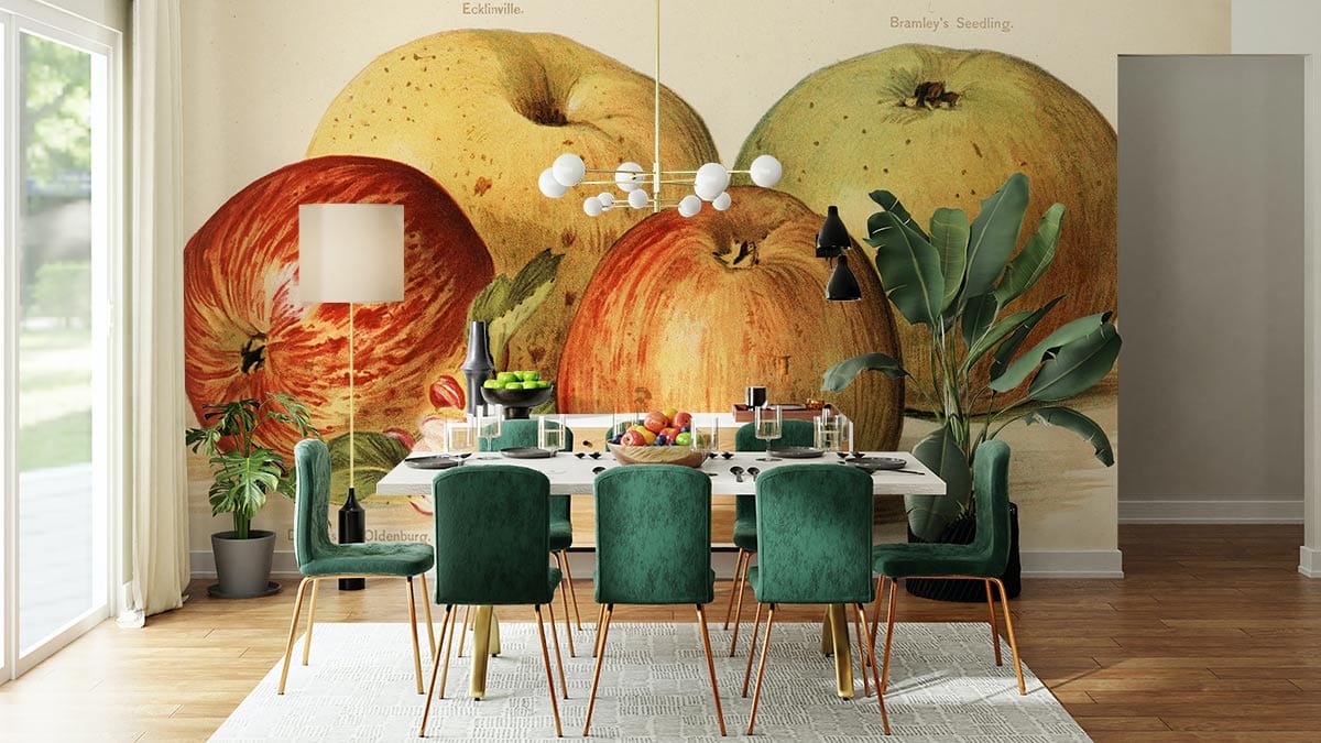 Are you looking for a kitchen wallpaper mural with an apple theme? Check out our Vintage Apples Wallpaper Mural. This vintage-inspired mural features big, juicy apples that bring a fresh, unique look to any wall. This mural is a real treasure-trove for lovers of retro style, evoking the charm of yesteryear with its soft colour palette and na茂ve hand-drawn patterns. This stunning mural wallpaper will add an authentic touch to your home, instantly transforming it into a truly charming place to live.