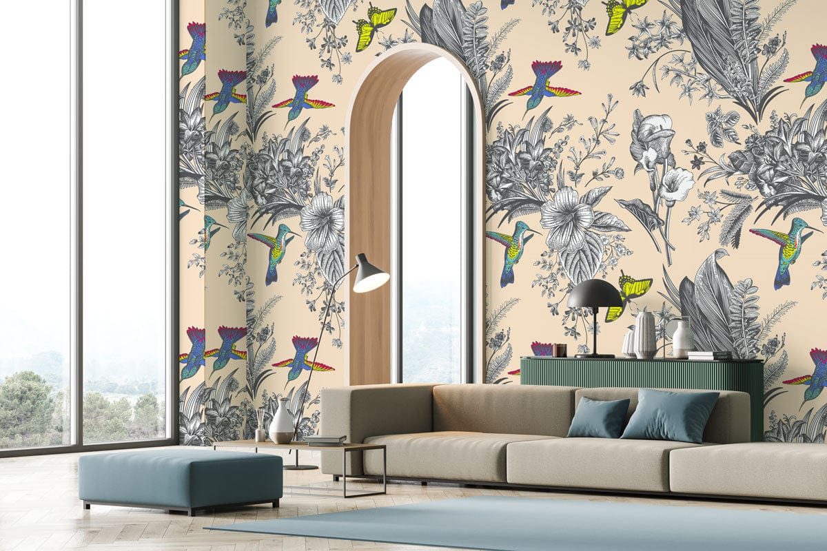 Immerse yourself in the charm of bygone eras with the Vintage Birds & Bouquets Wallpaper Mural. This exquisite design showcases delicate hand-drawn birds and intricate bouquets, set against a subtle backdrop. The harmonious interplay of vibrant avian hues with monochrome floral motifs creates a sophisticated elegance, effortlessly adding depth to any room. Ideal for spaces seeking a touch of classic artistry and refined grace.