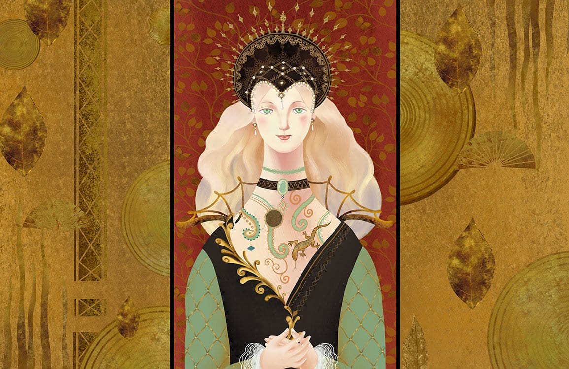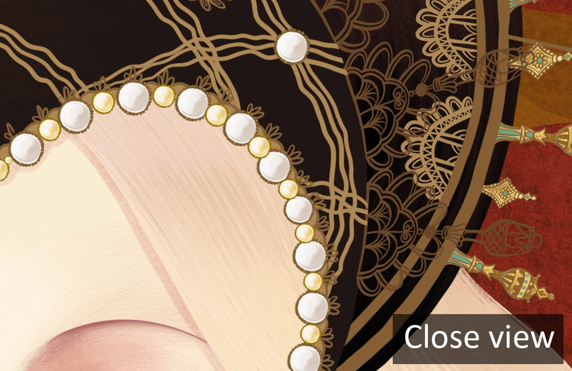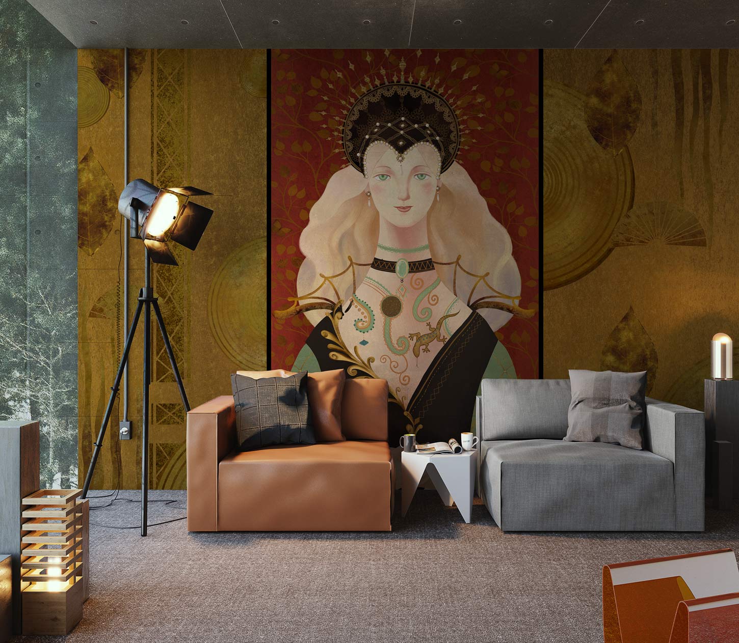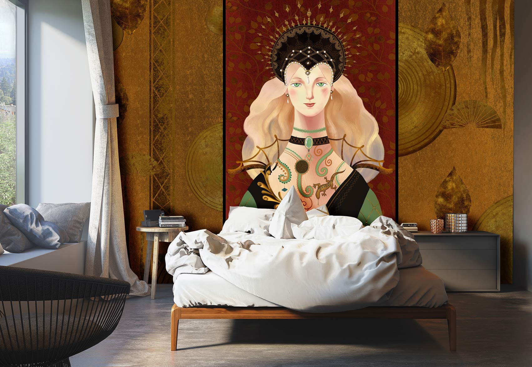 The Elegant Queen Wallpaper Mural captures a regal essence, featuring an exquisite illustration of a queen adorned in intricate patterns against a warm, golden backdrop. Her graceful demeanour and the surrounding subtle motifs create a harmonious blend of art and sophistication. This mural serves as a timeless piece, perfect for adding a touch of class to any interior setting.