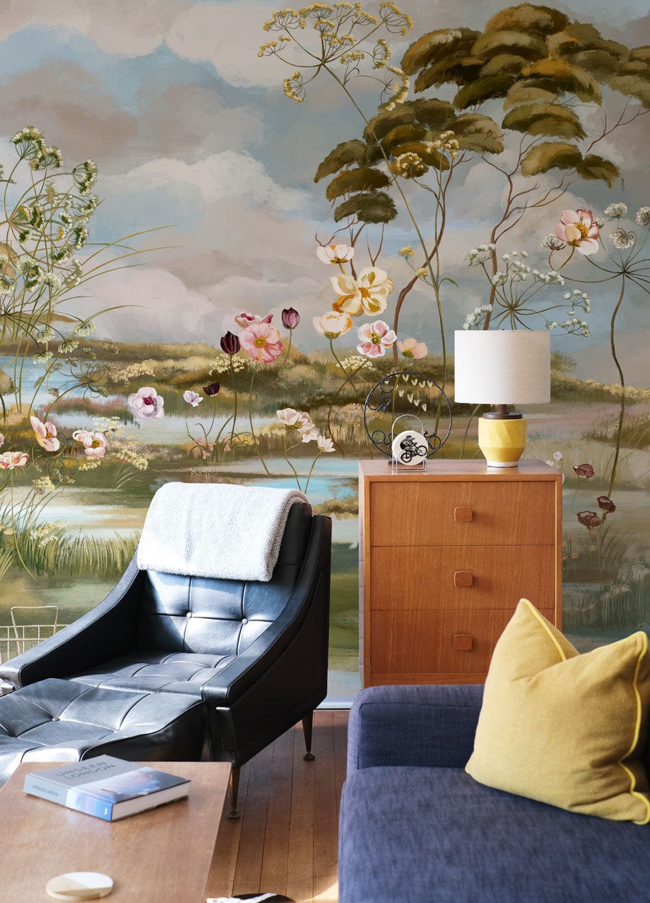Immerse your space in the serene elegance of this Vintage Flower Scenery Wallpaper Mural, where delicate blossoms bloom amidst tranquil blue and muted green hues. The intricate artistry captures nature's timeless beauty, making it a refined addition to any interior. Ideal for cultivating a calm and sophisticated atmosphere, this mural complements both classical and modern settings effortlessly.