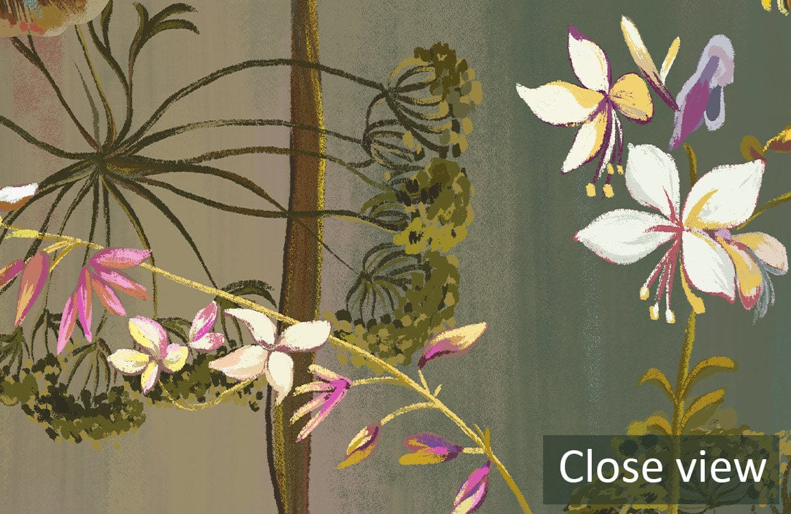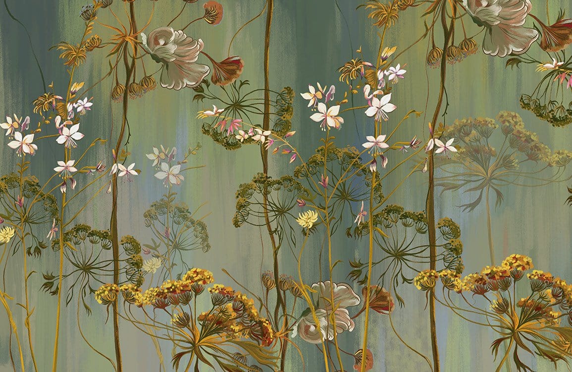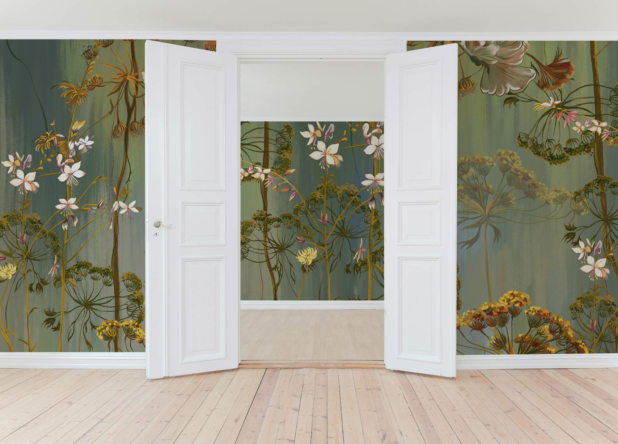 Immerse your space in a captivating tapestry of nature with the Vintage Flowers II Wallpaper Mural. This exquisite design features delicate florals intertwined with graceful vines set against a deep, verdant backdrop. The intricate details and elegant hues offer a refined ambience that seamlessly fits into both classic and contemporary interiors.