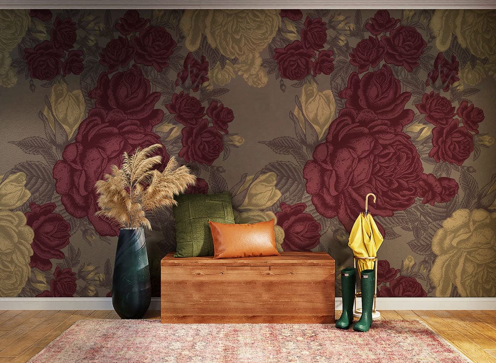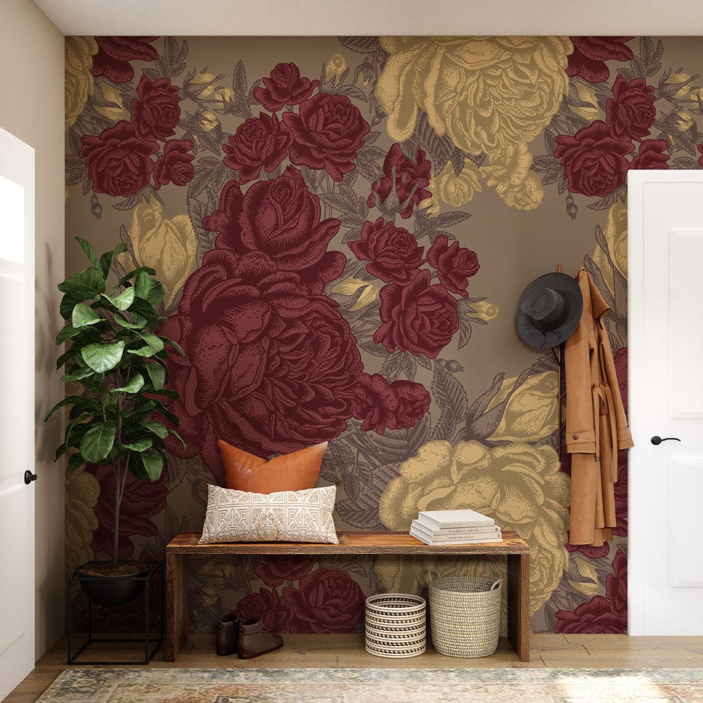Step into a sophisticated realm with the Vintage Large Peonies Wallpaper Mural, where opulent blooms unfold gracefully across your walls. Intricately detailed peonies in rich burgundy and soft cream tones create a captivating display, set against a muted taupe backdrop. This mural exudes timeless elegance, making it a perfect choice for spaces that seek a touch of classic flair and artistic charm.