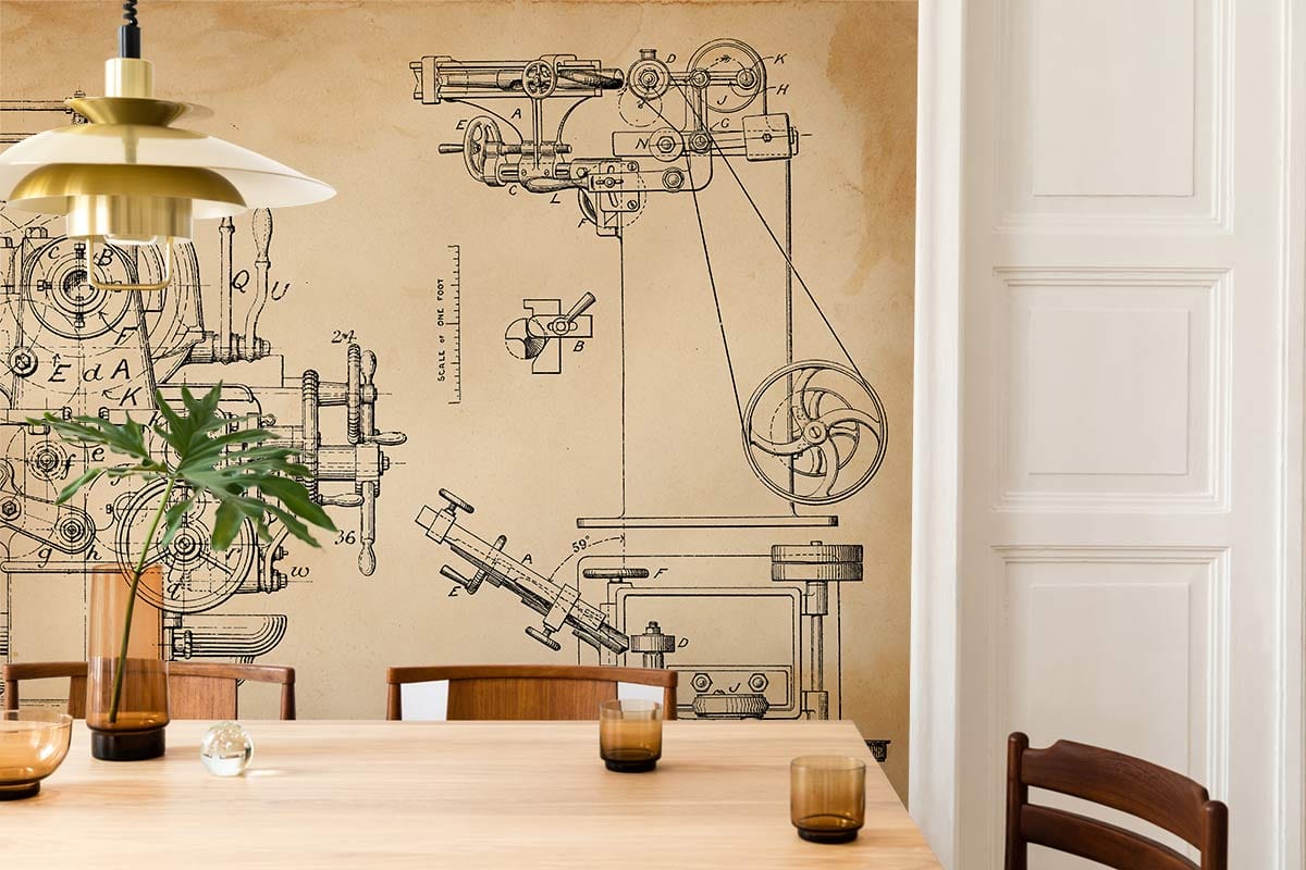 Immerse your space in an industrial charm with this Vintage Mechanical Parts Wallpaper Mural. Featuring intricate, hand-drawn schematics in exquisite detail, it evokes a sense of timeless engineering and craftsmanship. The muted tones seamlessly blend aged artistry with a refined aesthetic, making it an ideal centrepiece in both classic and contemporary interiors. Perfect for creating a captivating visual interest in your home or office.