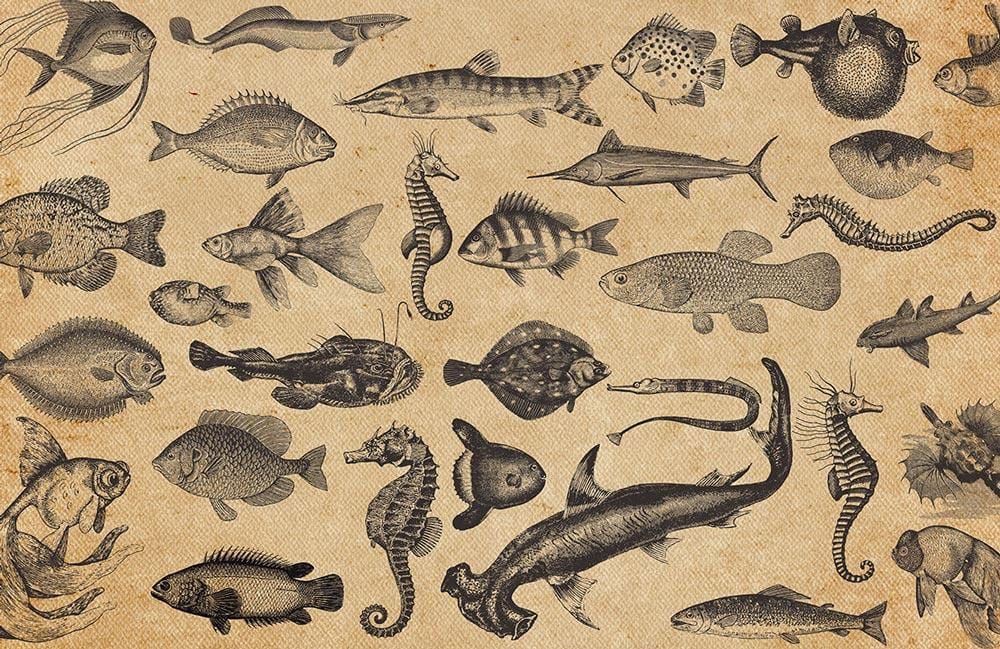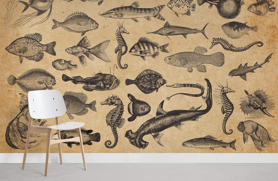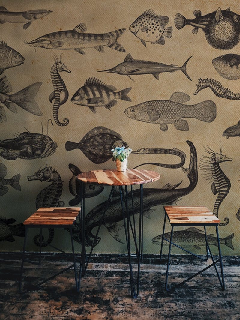 Dive into a captivating underwater realm with the Ocean Fish Wallpaper Mural. This design intricately showcases a variety of marine life, artfully rendered against a warm, textured background reminiscent of aged parchment. The wallpaper exudes sophistication with its detailed illustrations of fish and sea creatures, making it a timeless choice for interiors. Whether gracing the walls of a library or becoming a focal point in a dining area, this mural seamlessly merges artistic elegance with charming nostalgia.
