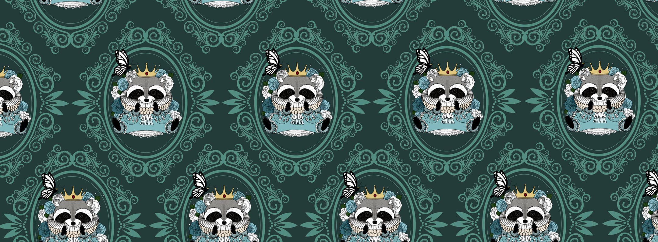 Infuse your space with whimsical charm through the Splicing Raccoon Wallpaper Mural. This delightful design features intricately detailed raccoons adorned with elegant crowns, framed by ornate motifs. The deep emerald backdrop exudes sophistication, while the playful raccoon illustrations add a touch of humour, making this mural both sophisticated and endearing. Perfect for creating a conversational piece that complements a range of interiors.