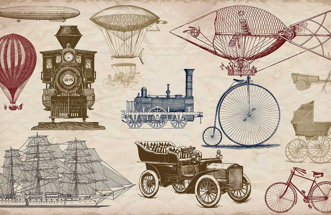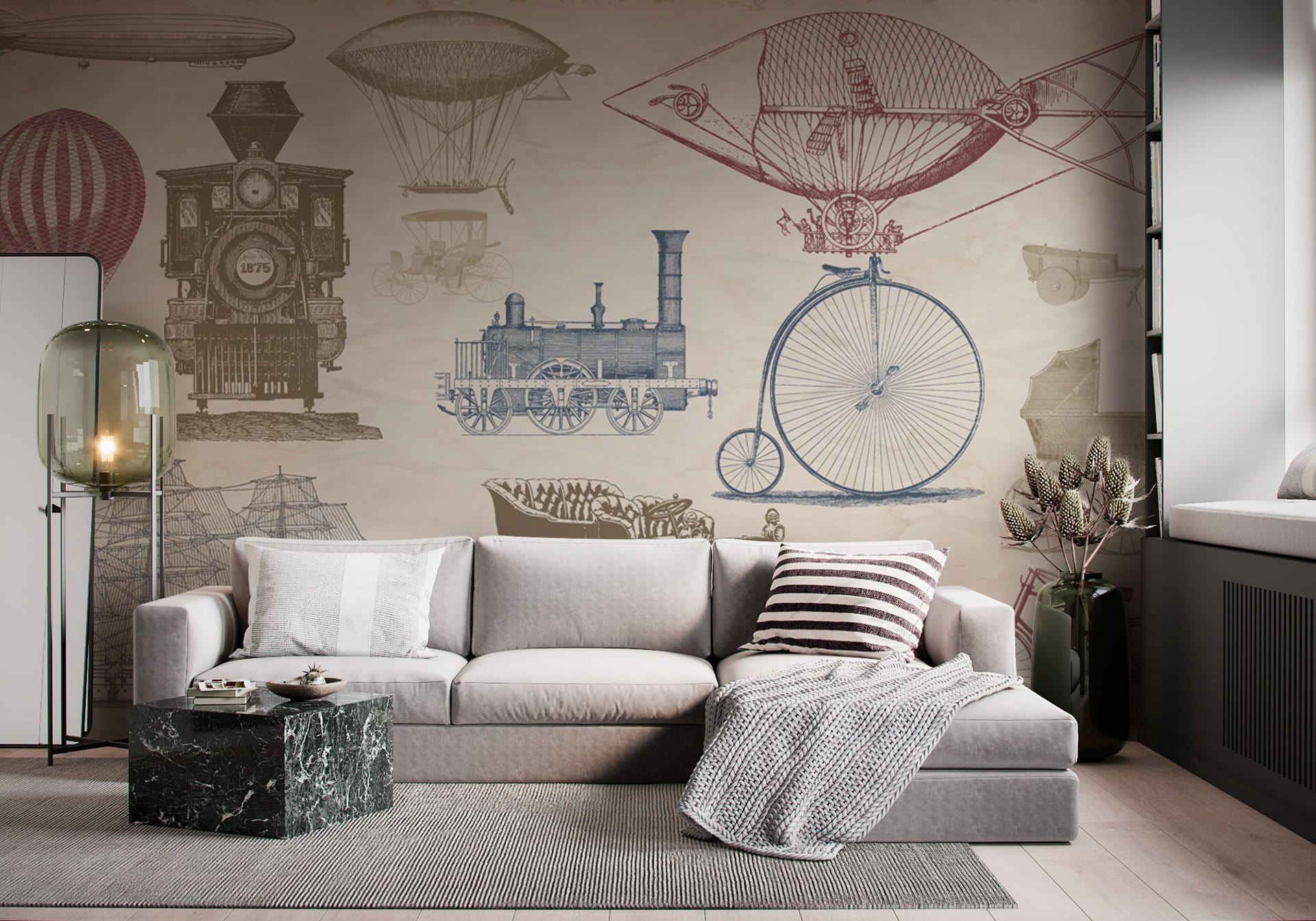 Discover a tapestry of timeless travel with our Vintage Vehicles Wallpaper Mural. Featuring intricately detailed sketches of historic ships, bicycles, and balloons on a warm beige background, this mural weaves a story of classic exploration. Its artistic composition brings a nostalgic charm to any room, marrying history with art in a way that is both distinguished and inviting.