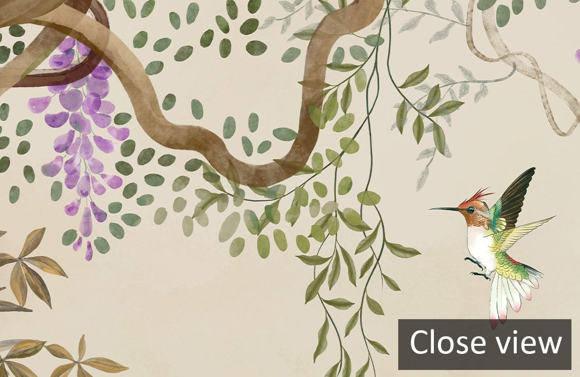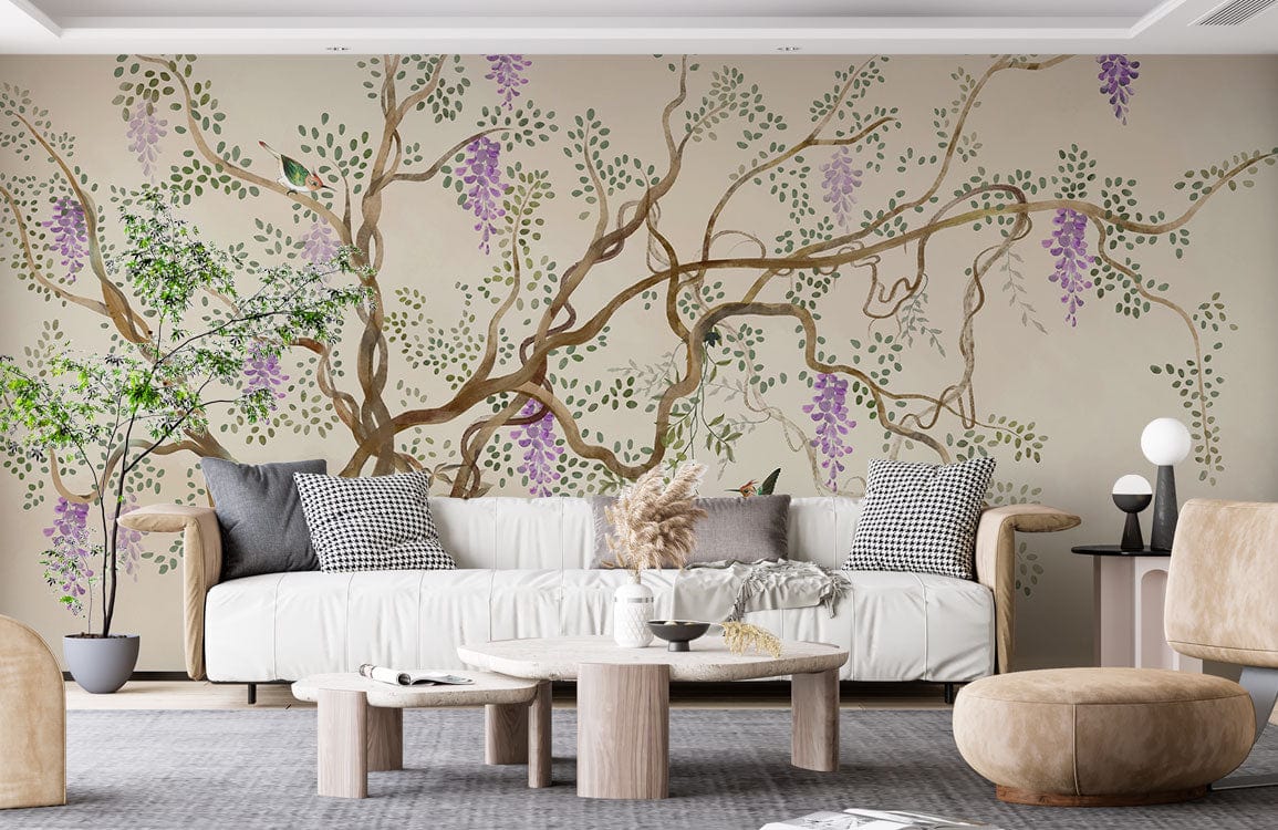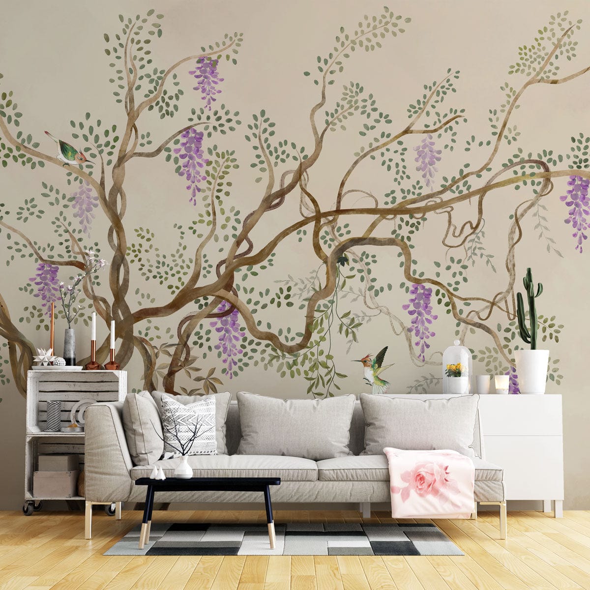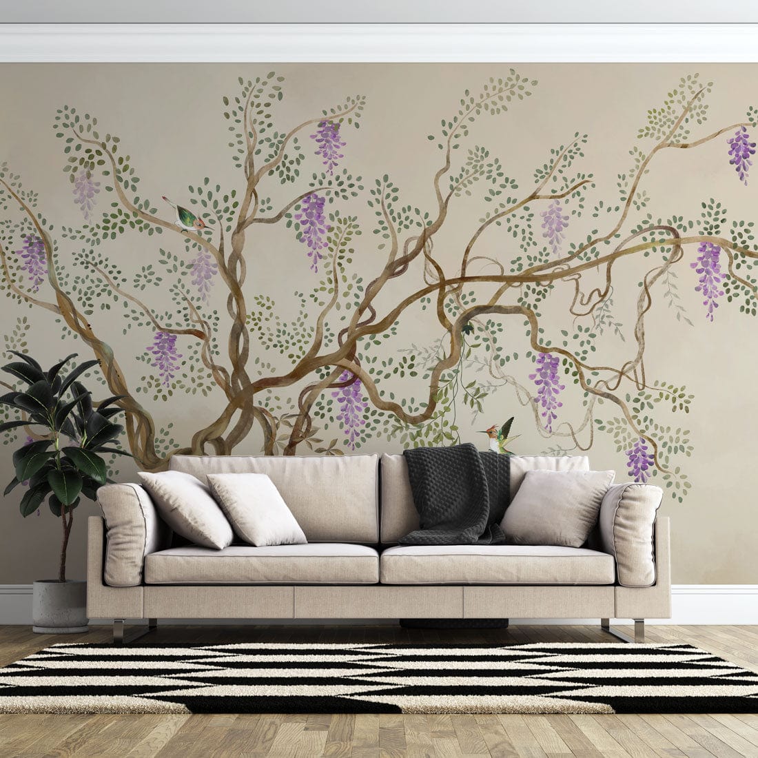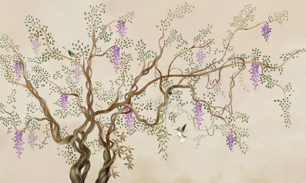 This Vintage Wisteria Tree Wallpaper Mural artfully captures the graceful elegance of nature, featuring delicately twisting branches adorned with cascading lilac blossoms. The intricate details and earthy textures evoke a sense of timeless tranquillity, making it a perfect fit for spaces that crave a touch of sophistication and serene charm.