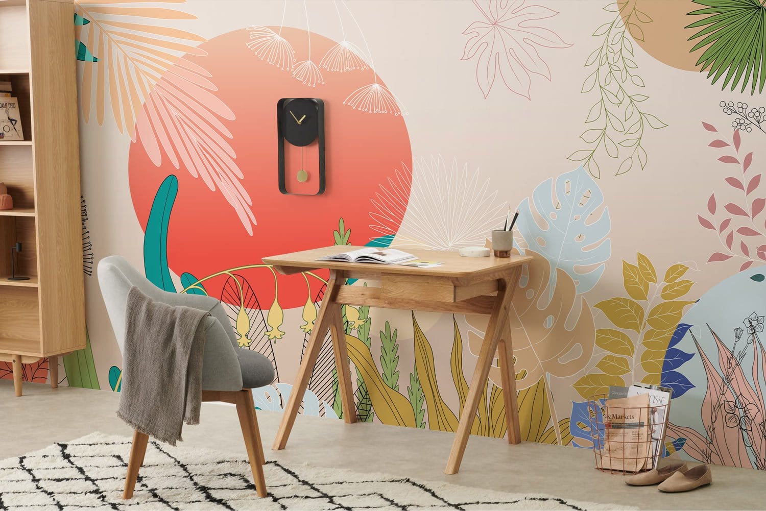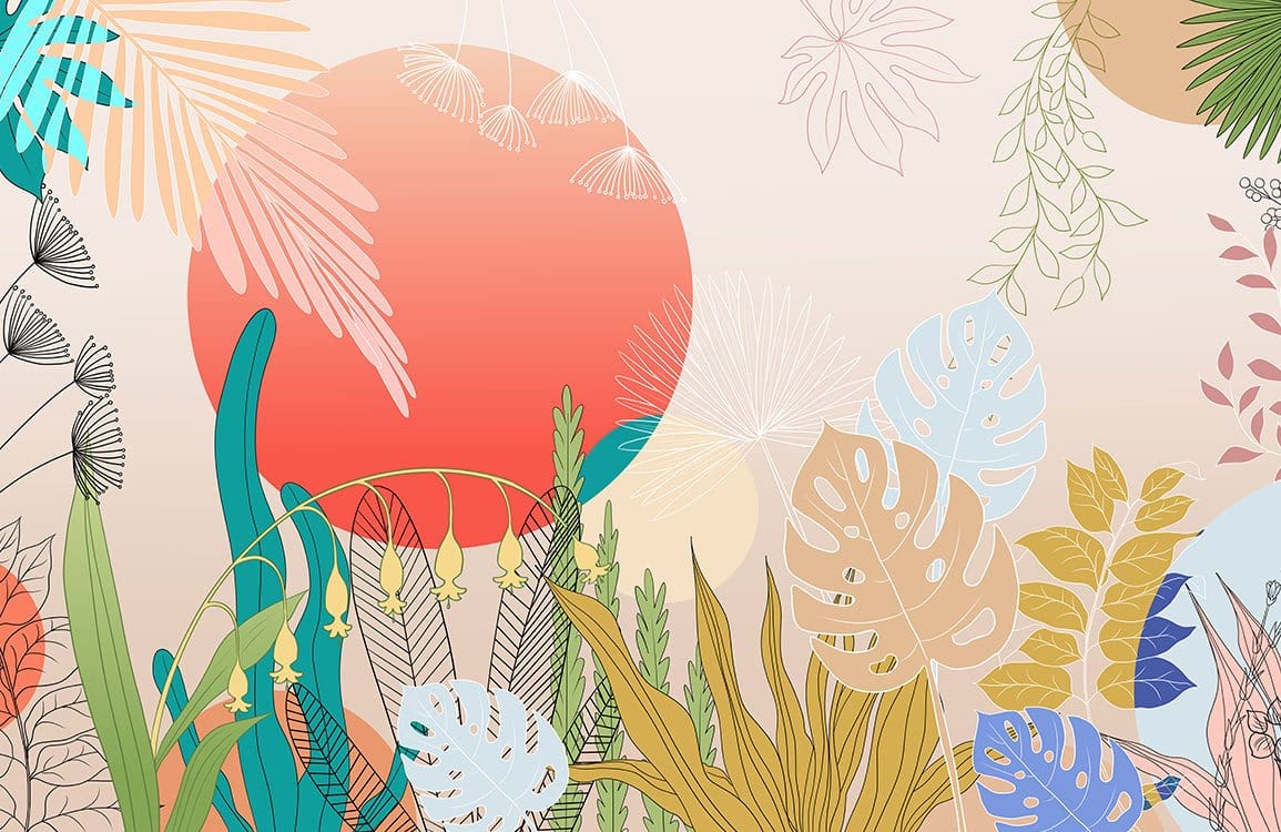 Vitality Wallpaper Mural captivates with its dynamic interplay of botanical elegance and sunset hues. Featuring intricately detailed leaves and delicate floral accents, it brings a serene yet vibrant aura to any space. This exquisite mural harmoniously complements a variety of interiors, whether seeking a touch of nature in a modern lounge or a sophisticated statement in a classic reading nook.
