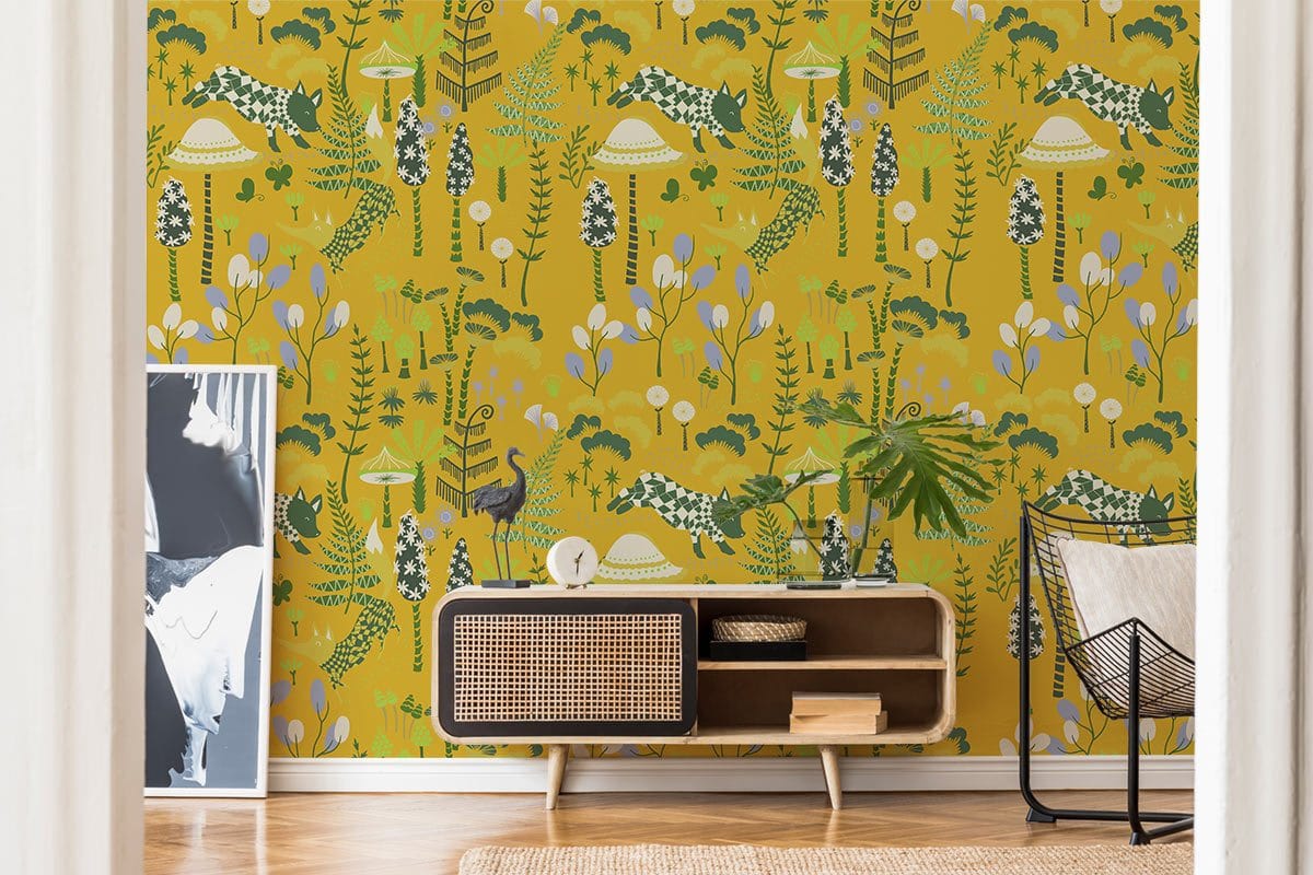 Wandering Fox III Wallpaper Mural captures the whimsical charm of an enchanted forest, featuring playful foxes and delicate foliage. Its intricate design and earthy palette create a delightful harmony, seamlessly fitting into both contemporary and classic interiors.