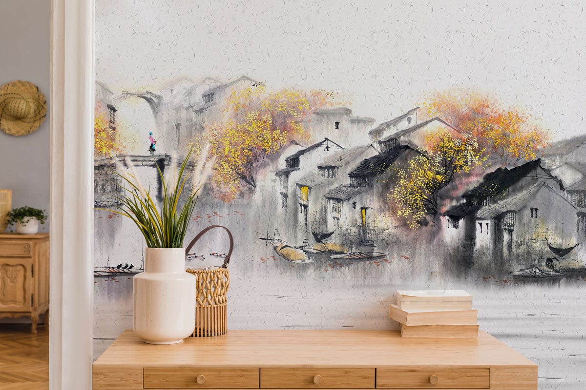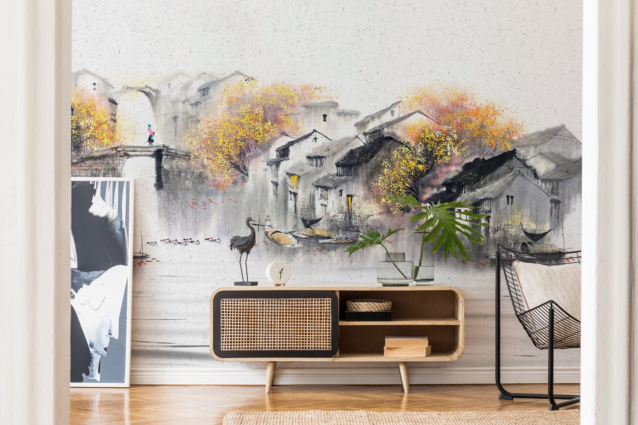 Immerse yourself in the tranquil charm of the Water Village Wallpaper Mural, where serene reflections of quaint cottages and golden autumn foliage drift across misty waters. This exquisite design breathes life into walls, inviting serenity and sophistication into myriad interiors. Each brush stroke resonates with elegance, echoing the timeless beauty of pastoral landscapes, making it an ideal backdrop for any discerning space.